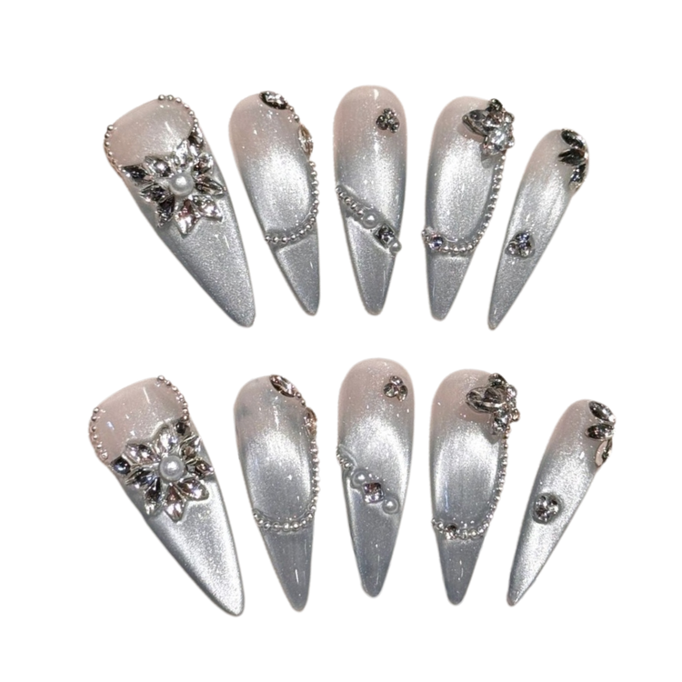Metallic silver shimmer with crystal chains and pearl-embellished crowns, exuding icy royal glamour.
