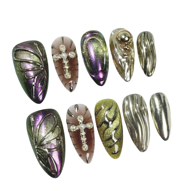 Metallic cosmic hues and gem-like details merge into a mystical design that feels ancient yet futuristic.