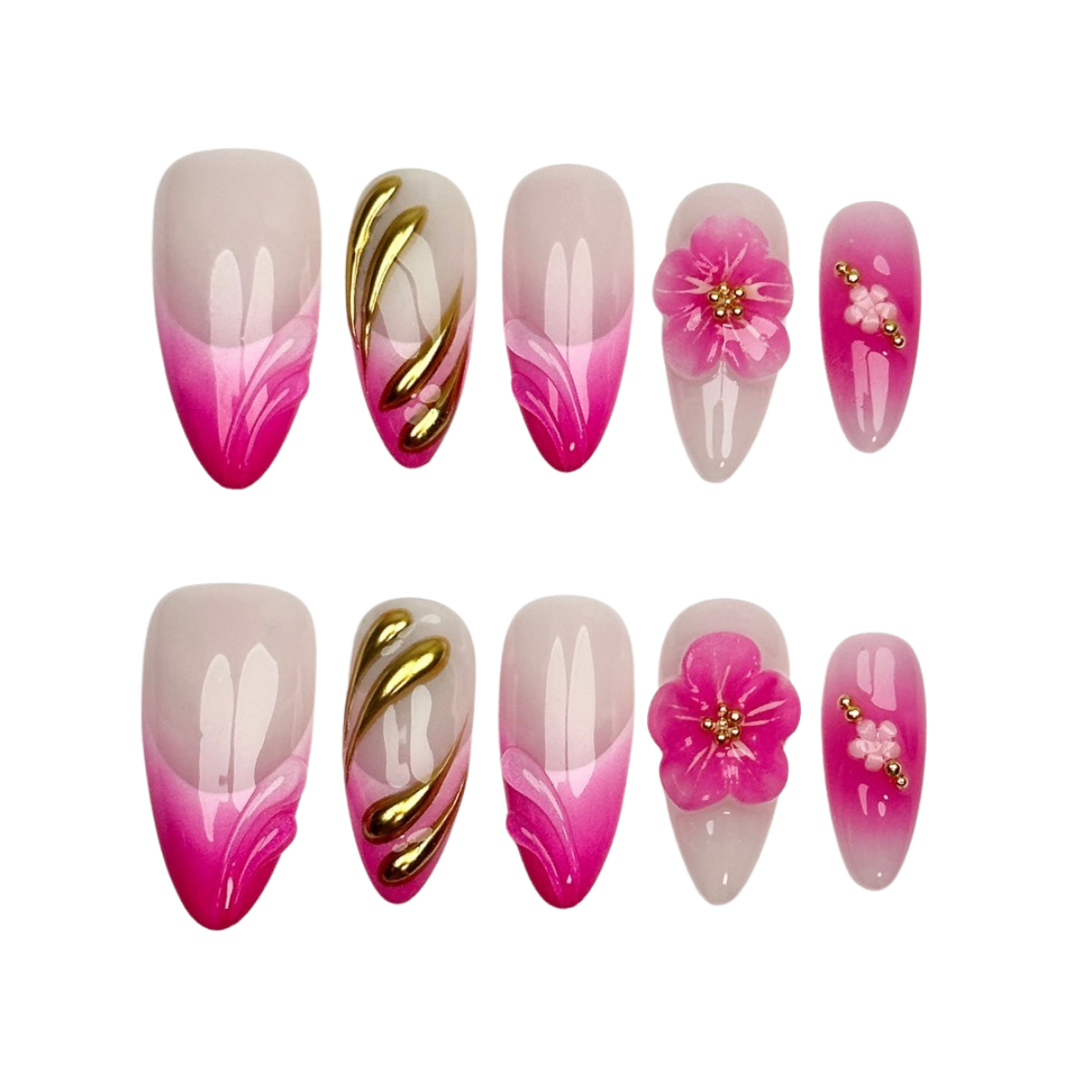 Vibrant hot-pink gradient with golden swirls, 3D florals, and delicate crystal accents for a bold yet feminine finish.