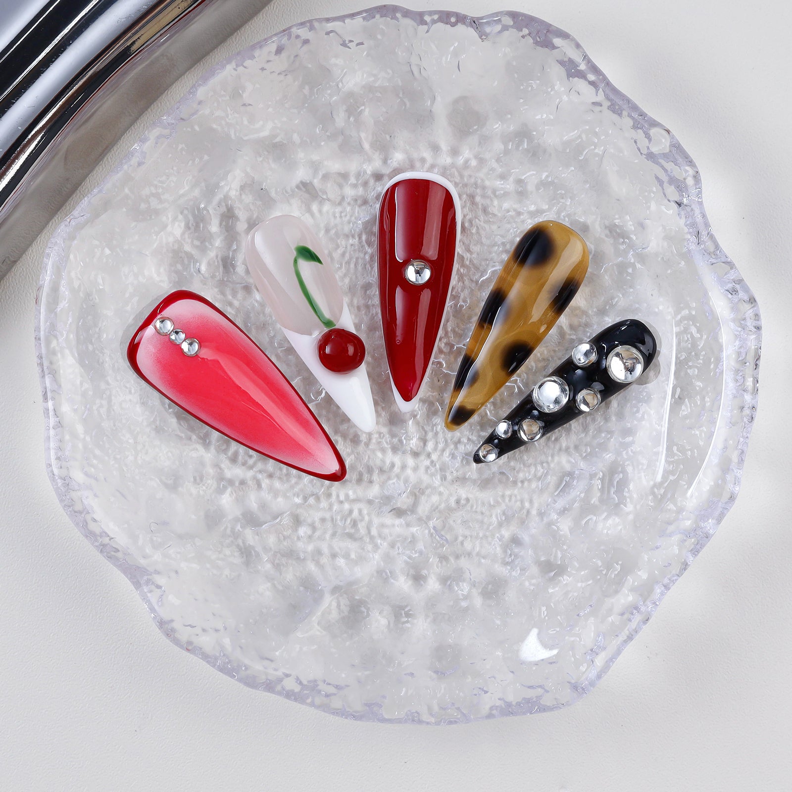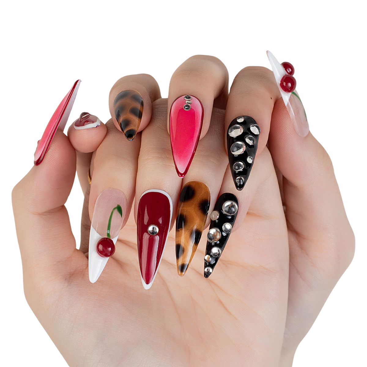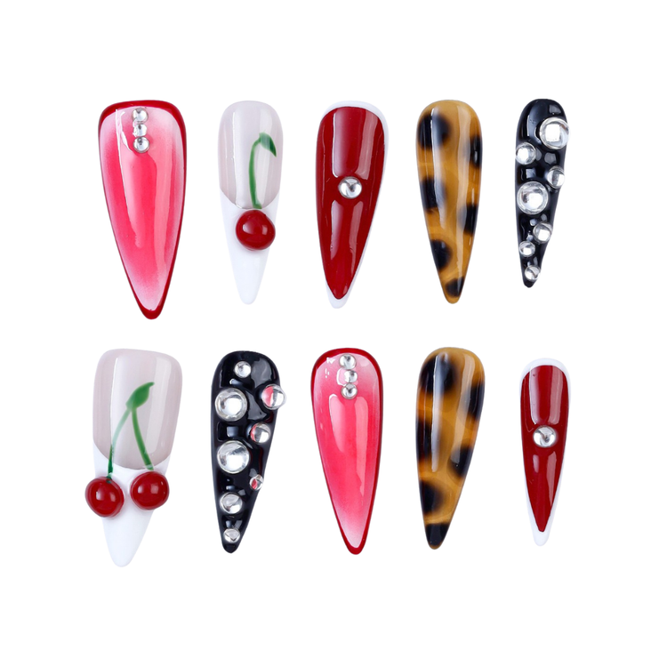 A playful mix of glossy reds, bold cherries, and crystal accents - this juicy design blends sweetness with a daring edge for the ultimate statement look.