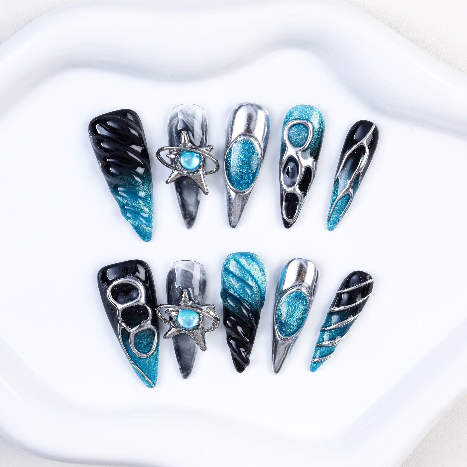 A futuristic fusion of teal shimmer, chrome accents, and cosmic star charms.