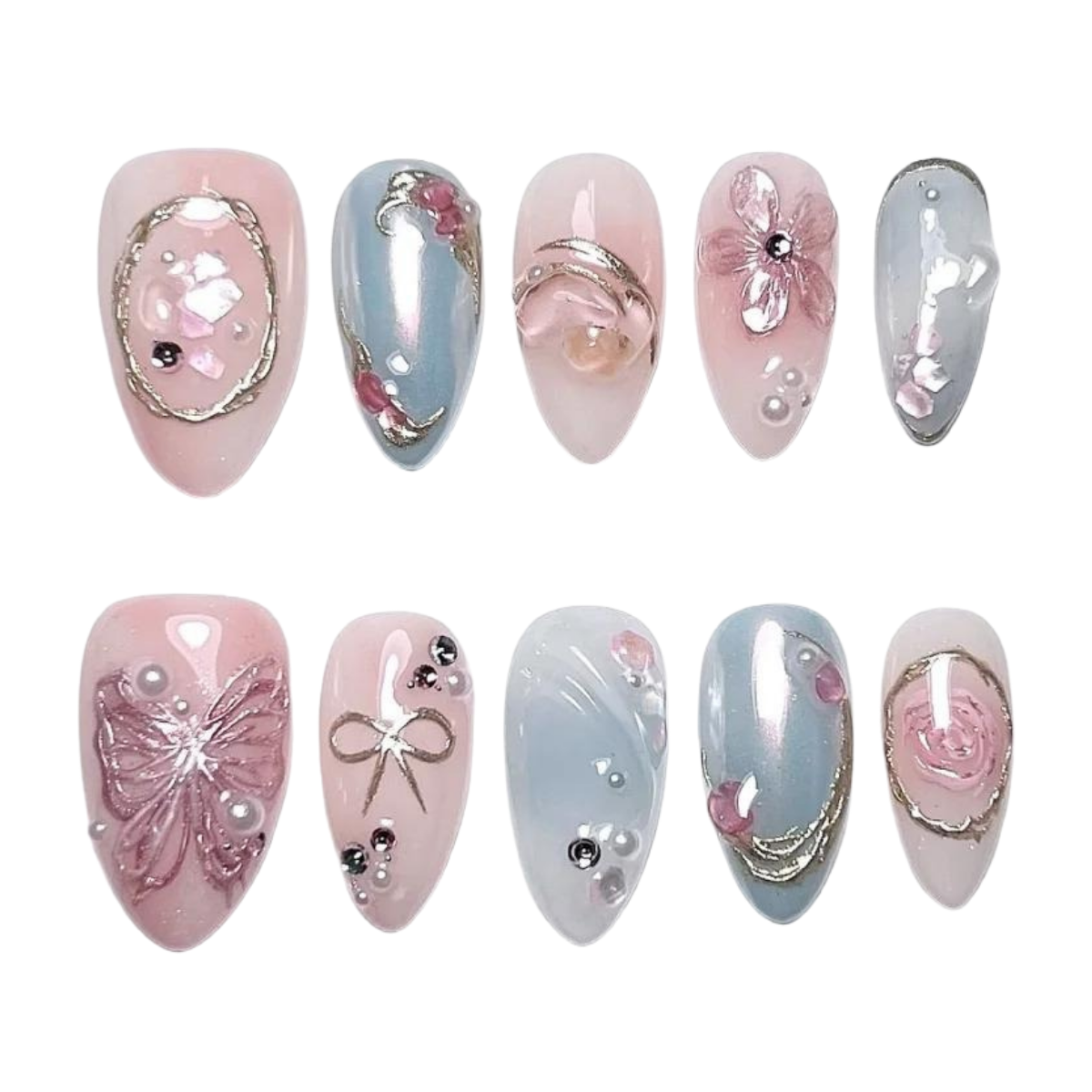 Baby-pink and pearl-blue pastels with 3D florals, butterflies, pearls, and crystal bows framed in silver for a dreamy, polished look.