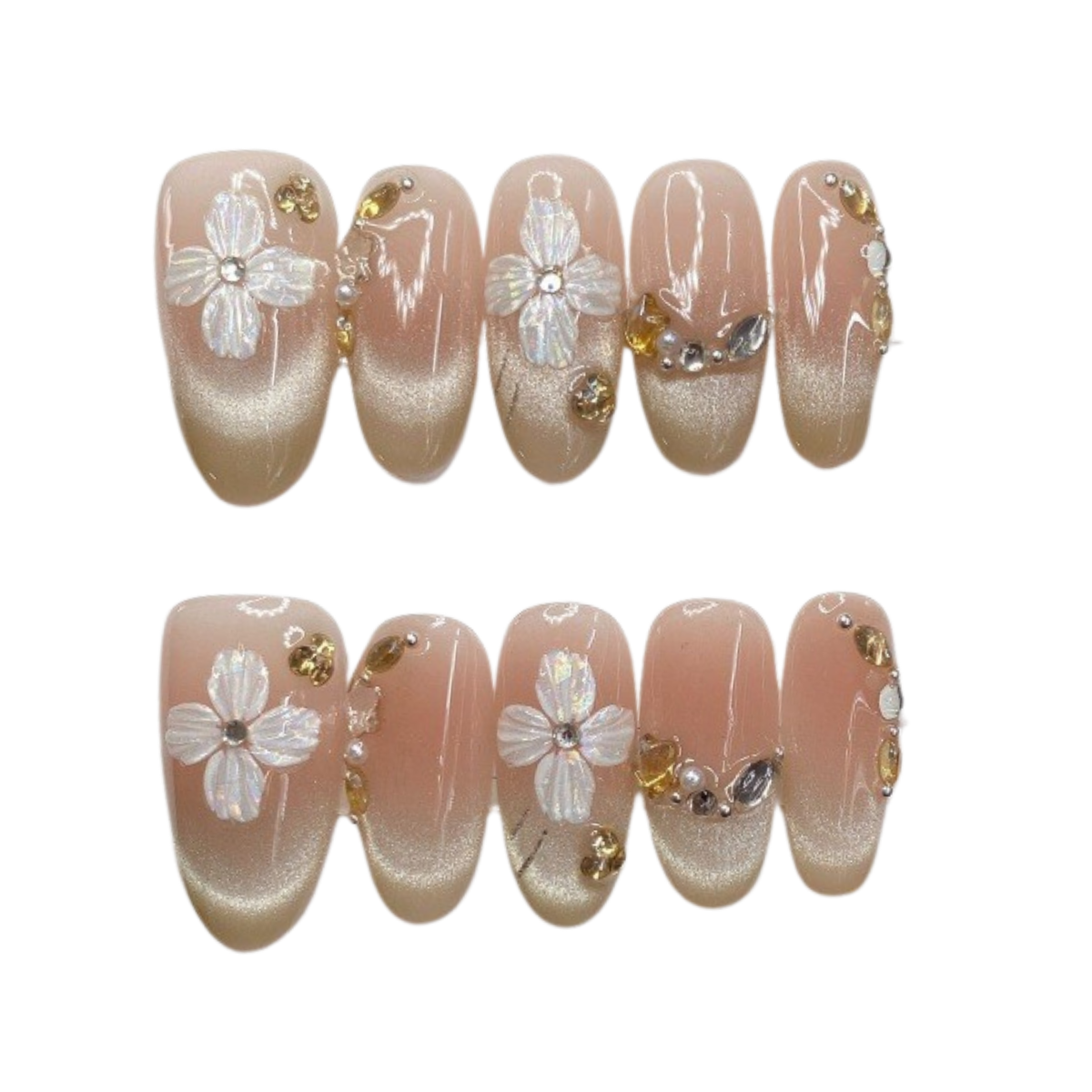 Nude shimmer kissed with golden sparkle and delicate floral gems
