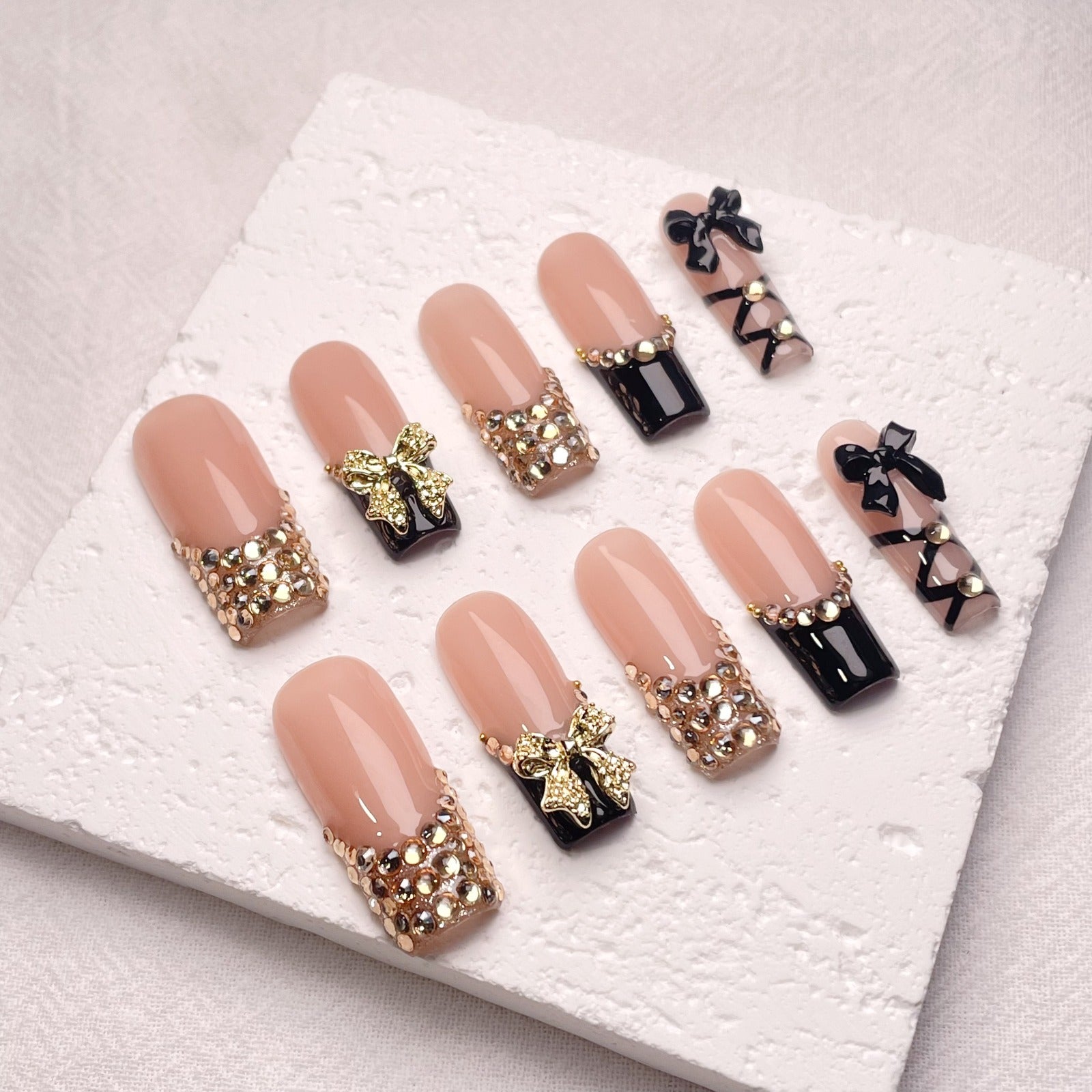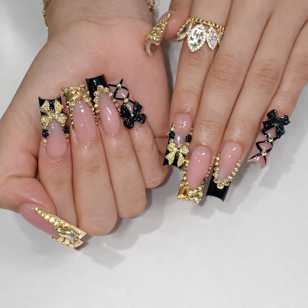 Playful sophistication with shimmering gold bows, crystal-studded tips, and glossy black accents for a chic statement.