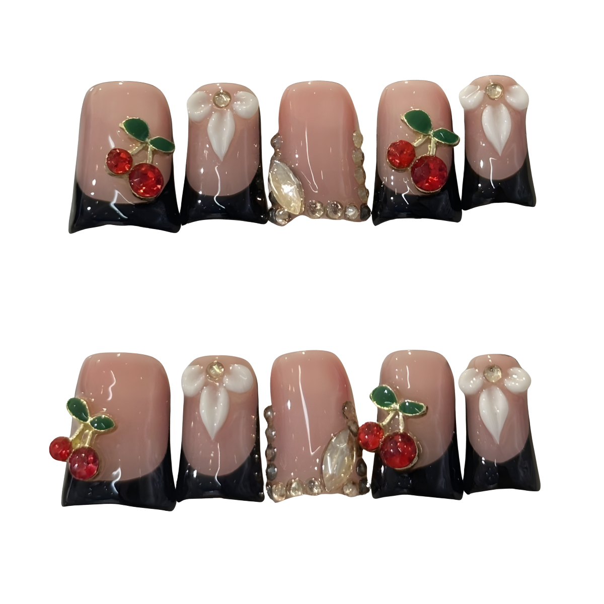 Playful meets edgy with glossy black tips, jeweled cherries, and delicate floral accents for a sweet yet bold vibe.