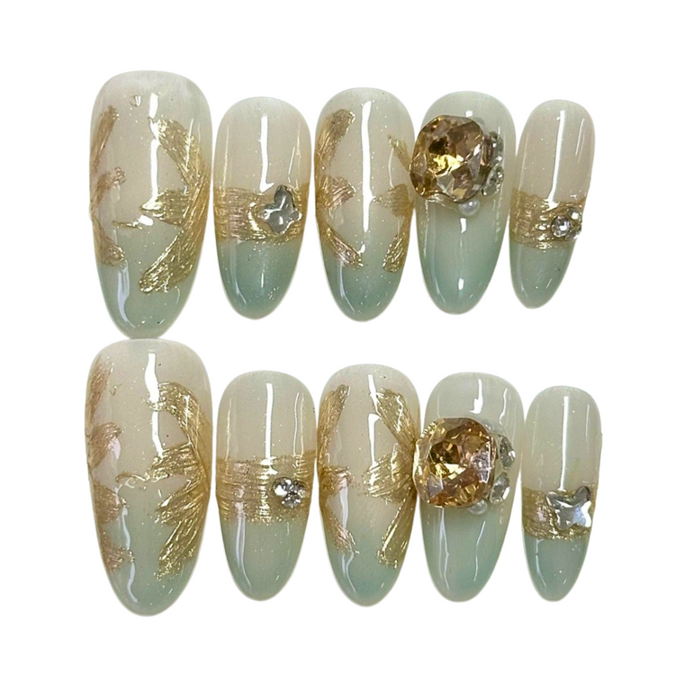 Soft sage-green ombré with golden marble accents and crystal embellishments, blending earthy calm with seasonal luxury.