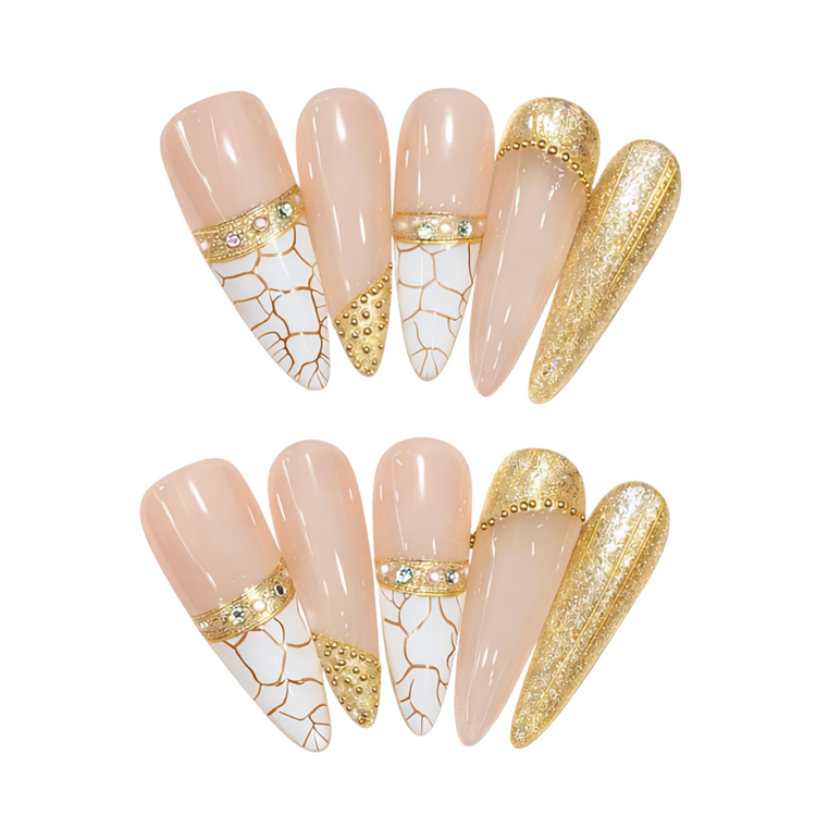 A bold skin tone base meets snakeskin French tips and gleaming gold glitter. Golden studs and crystals complete this luxe, exotic set