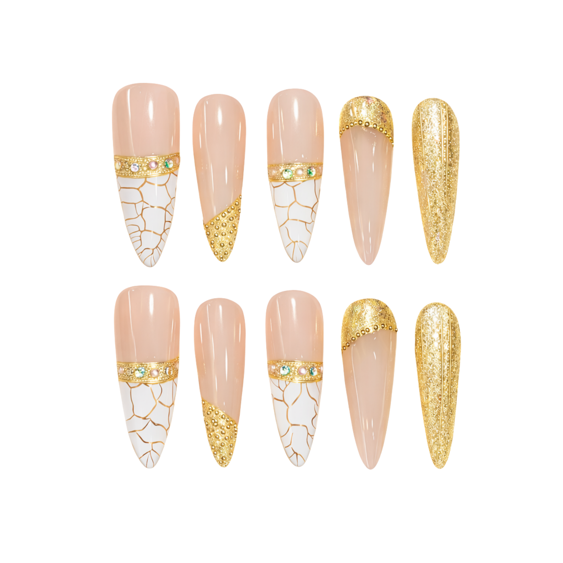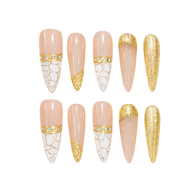An elegant press-on nail set featuring a soft, skin-toned base combined with refined gold detailing and subtle decorative accents. The design blends smooth glossy finishes with intricate metallic patterns, delicate texture contrasts, and carefully placed embellishments for a balanced, luxurious look.
