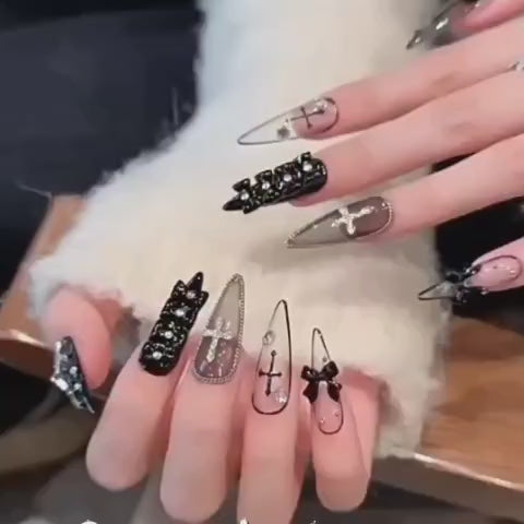 Elegant black and silver ombré nails adorned with jeweled crosses, bows, and dark accents, embodying gothic charm with a sacred edge.