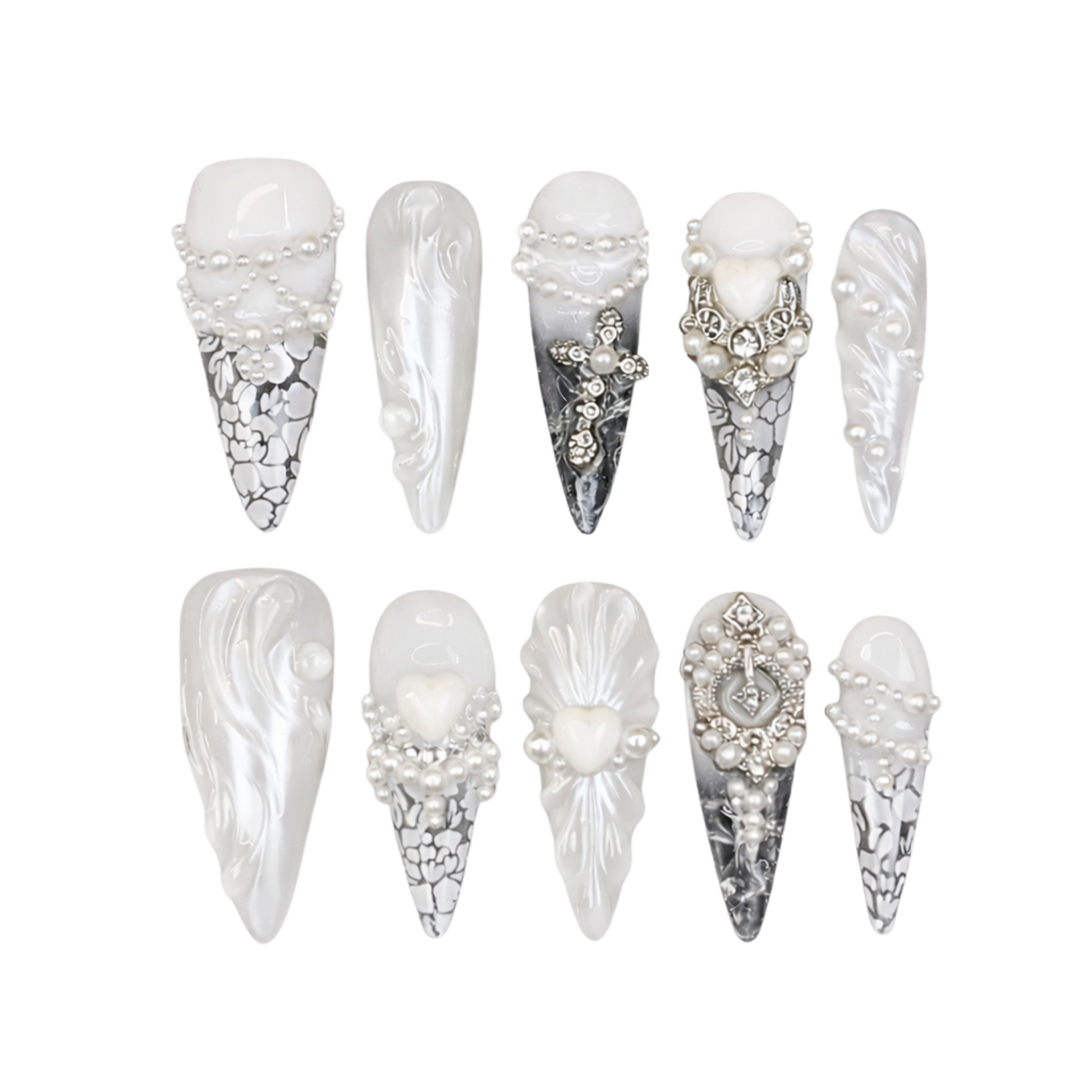 Raised textures and sculpted accents add depth and dimension, giving each nail a couture, handcrafted feel.