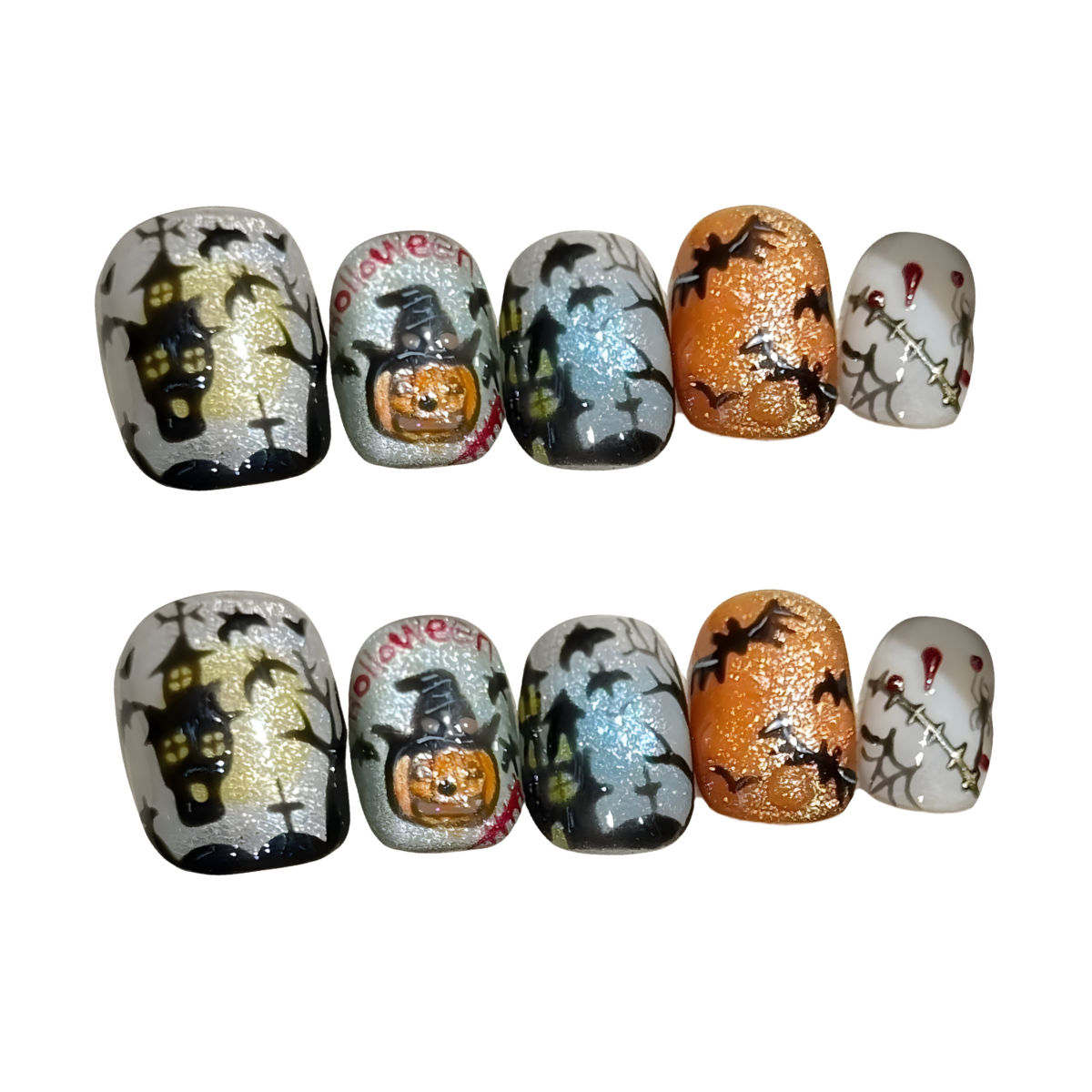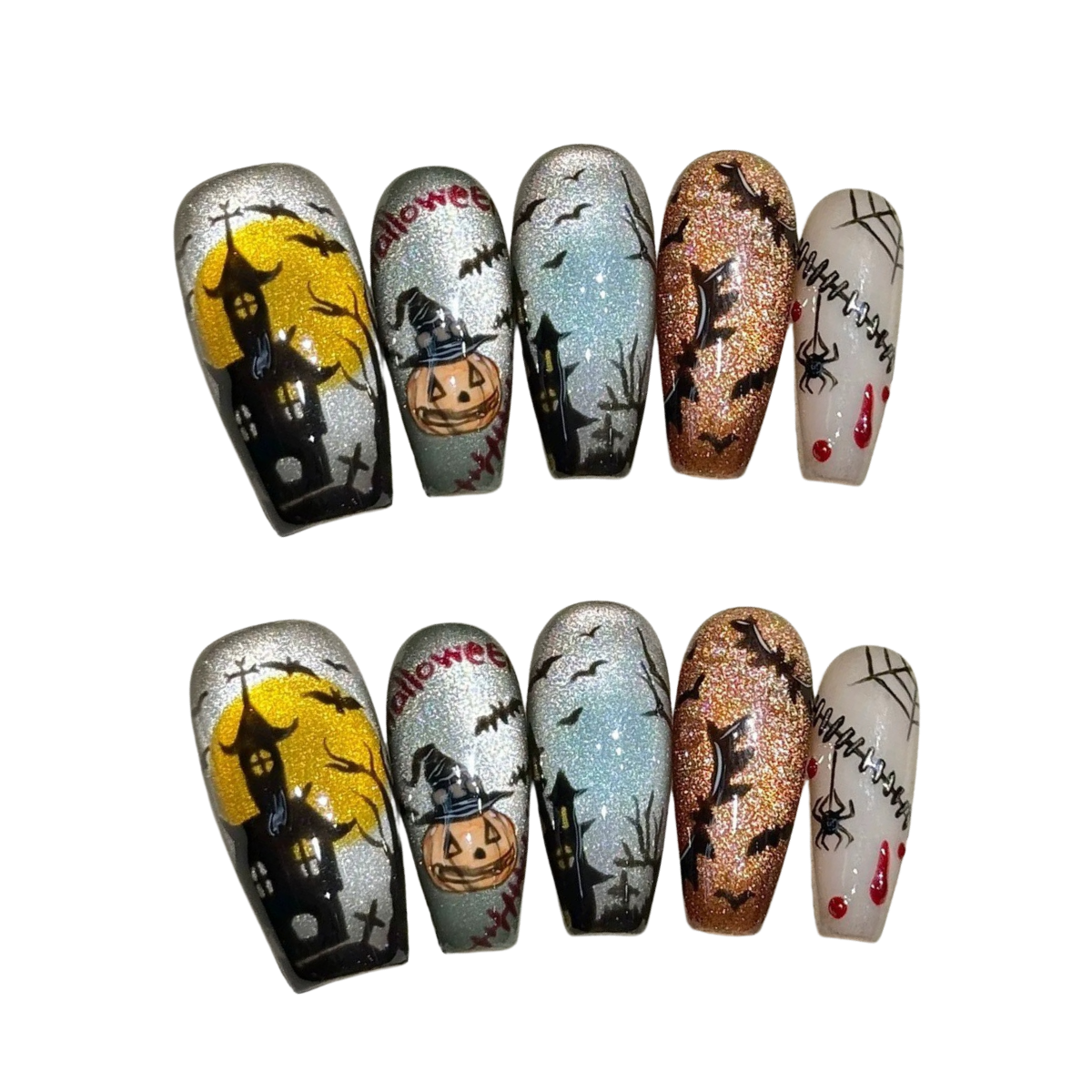 Glittering backdrops with haunted houses, pumpkins, bats, and eerie webs, capturing the chilling magic of Halloween under a full moon.