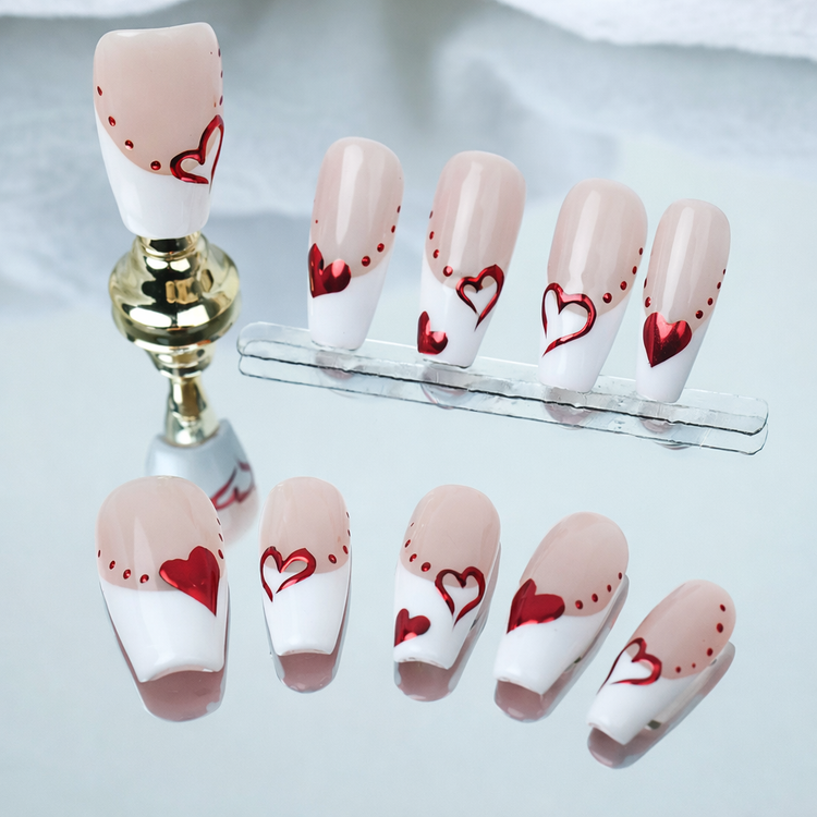 A clean, romantic design with soft blush and white tones, accented by red heart details that echo the rhythm of love - simple, sweet, and timeless.