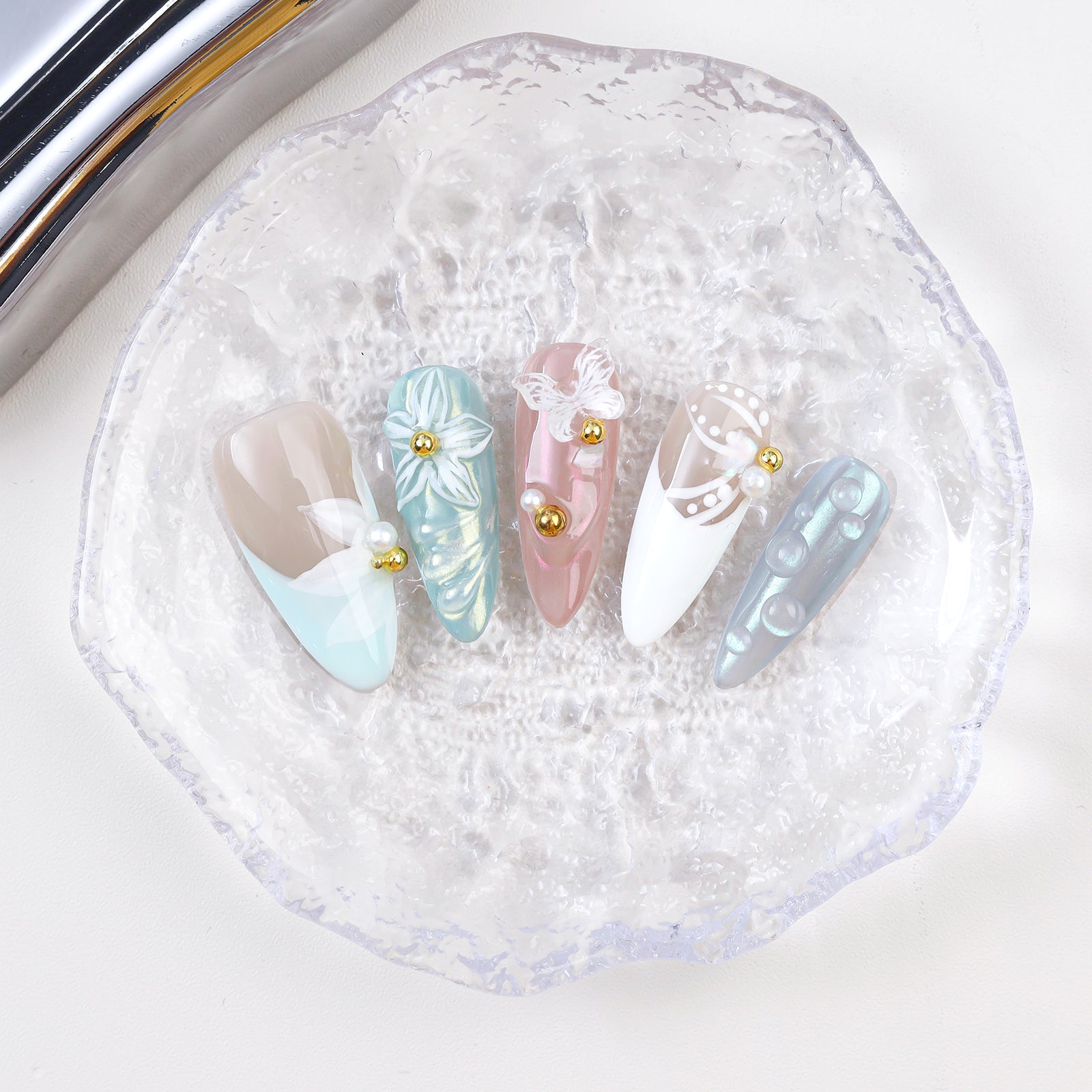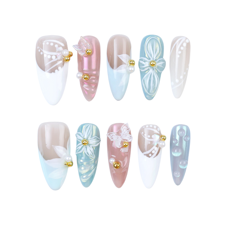 Soft shades of pearl blue, blush pink, and ivory meet delicate 3D flowers and butterflies - a dreamy, feminine design that feels light as air and endlessly graceful.