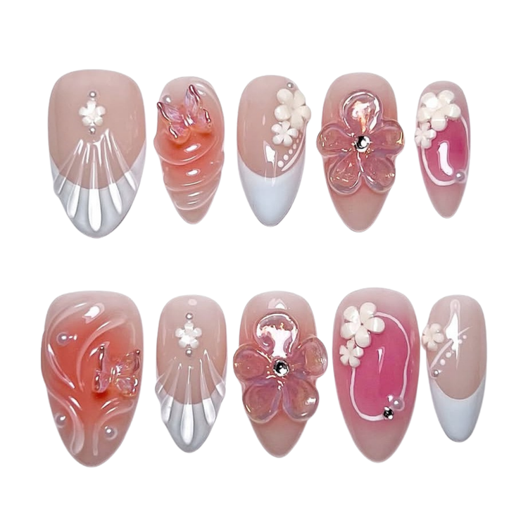 A nude-pink set with 3D flowers, rhinestones, and modern French tips for a soft yet refined look.
