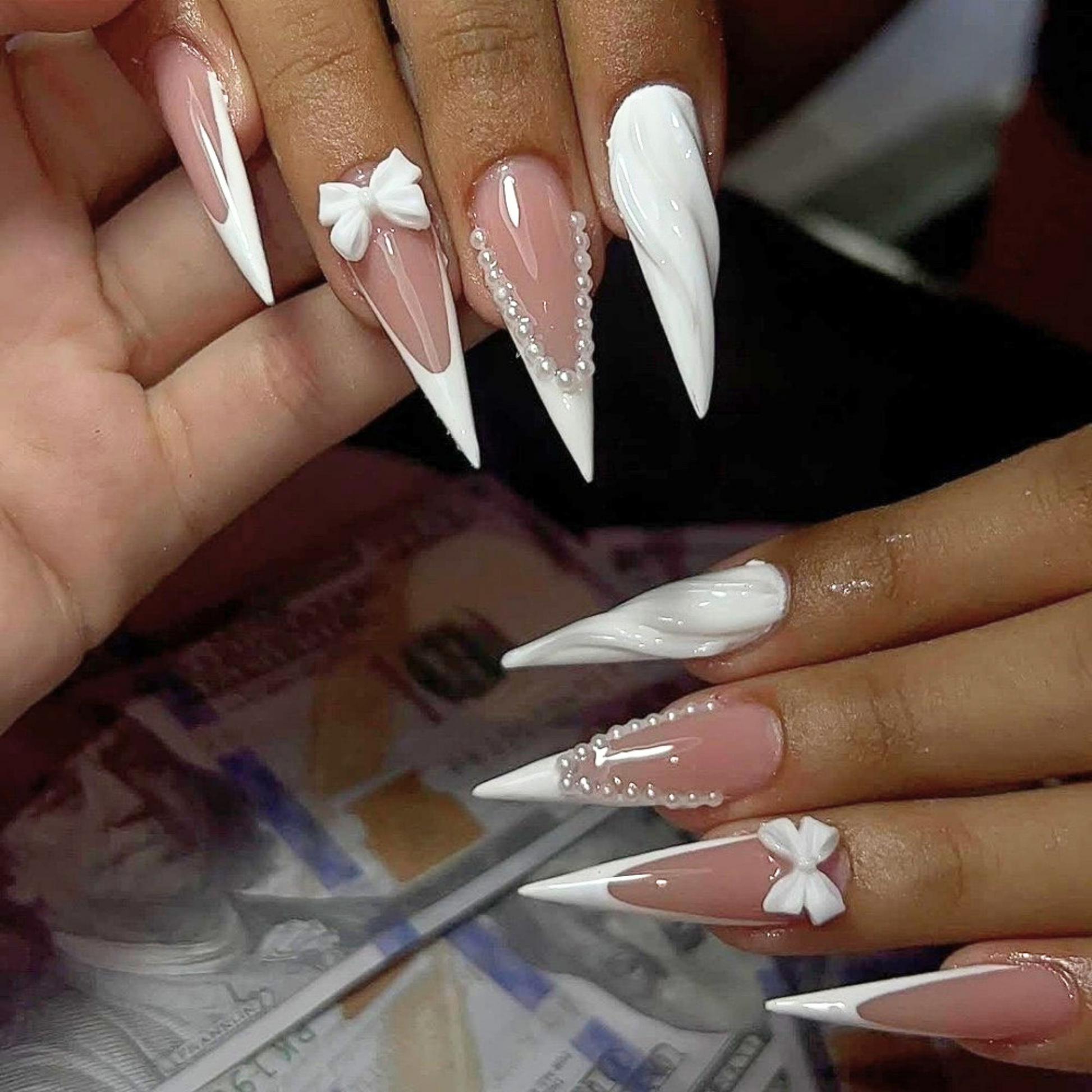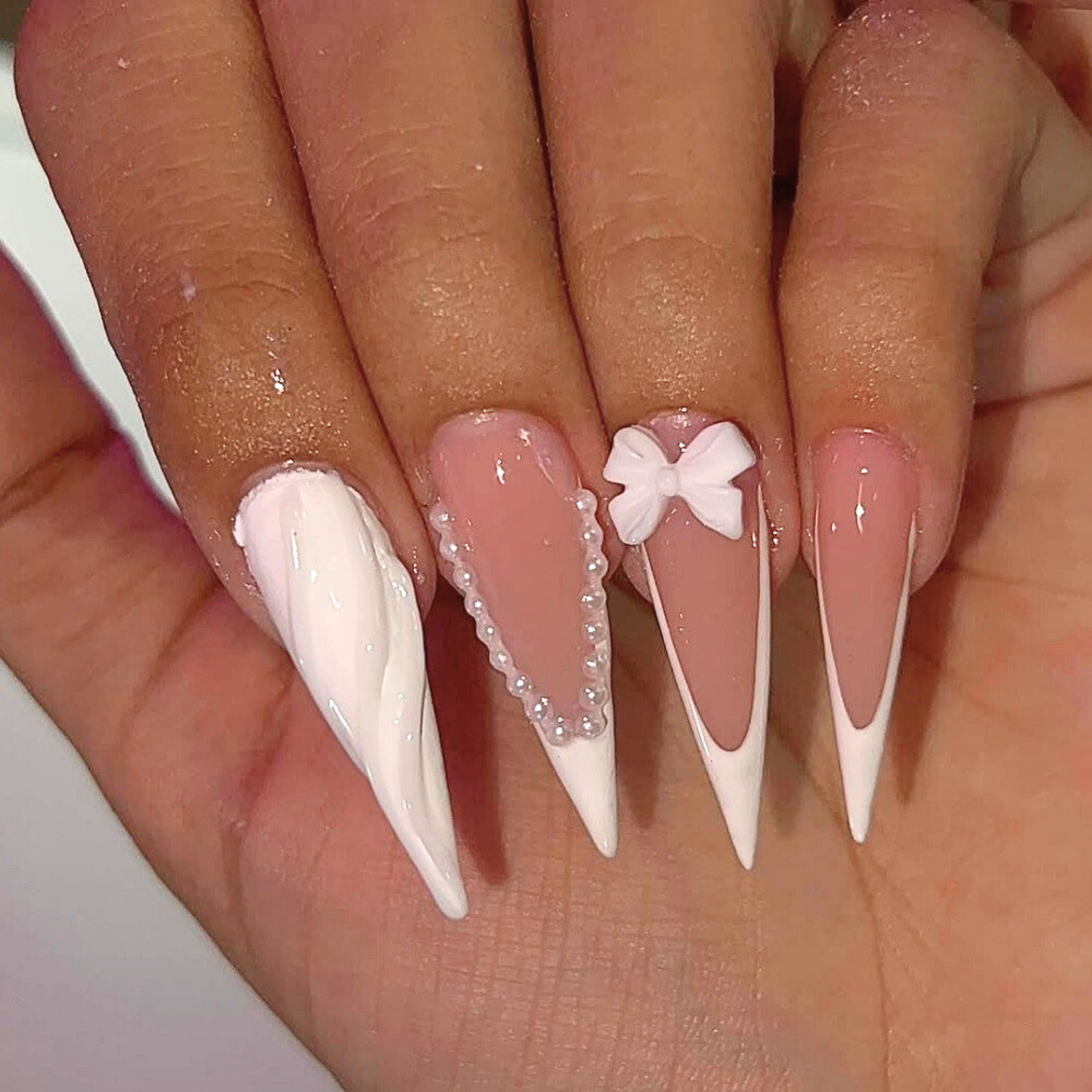 Soft blush-and-white French stilettos with pearls and 3D bows - a chic bridal look for your “I Do” moment.
