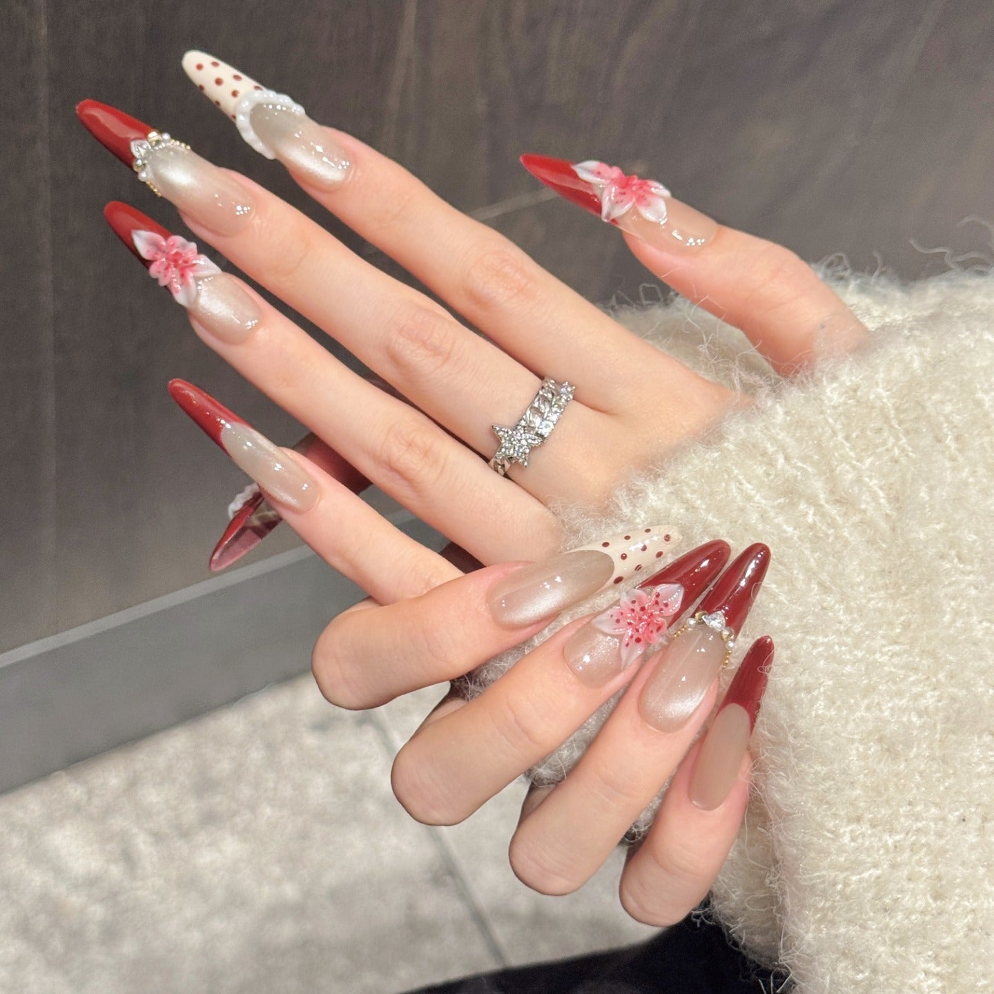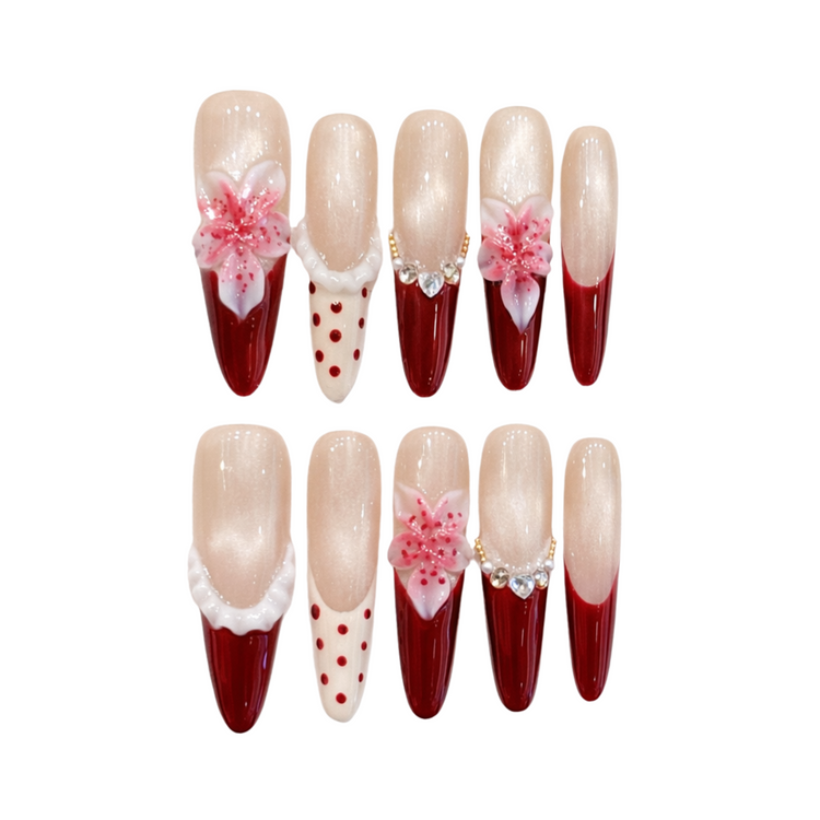 A soft skin-tone base with deep red tips, elevated by delicate floral accents and subtle crystal details.