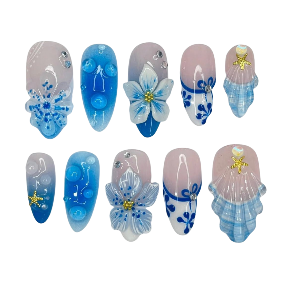 Vibrant blue and white nails with seashell textures, starfish charms, and tropical floral accents – a true ocean paradise.
