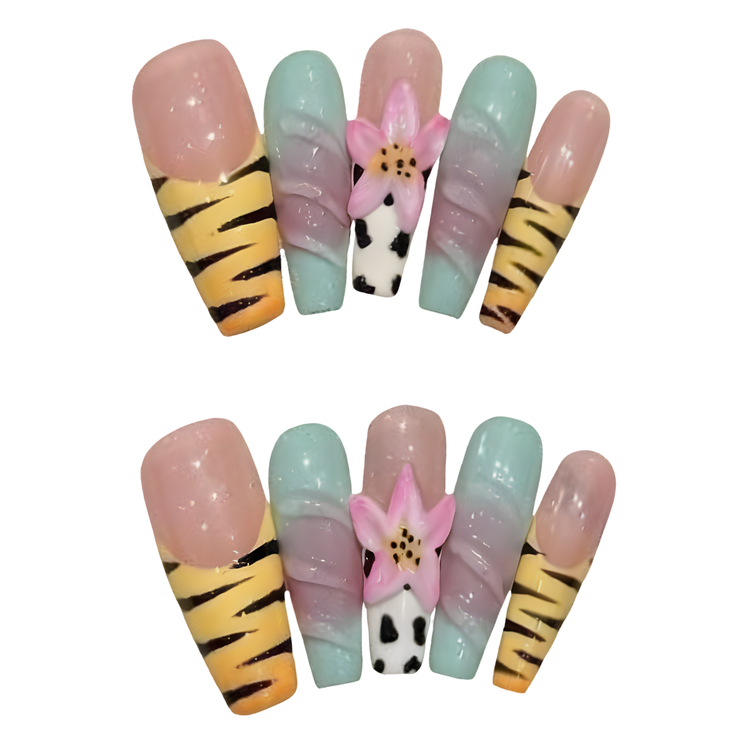 A wild and playful mix of tiger stripes, candy swirl pastels, and cow print – all tied together with a bold 3D pink flower. This vibrant set is perfect for fearless fun