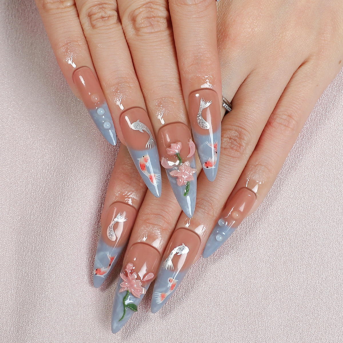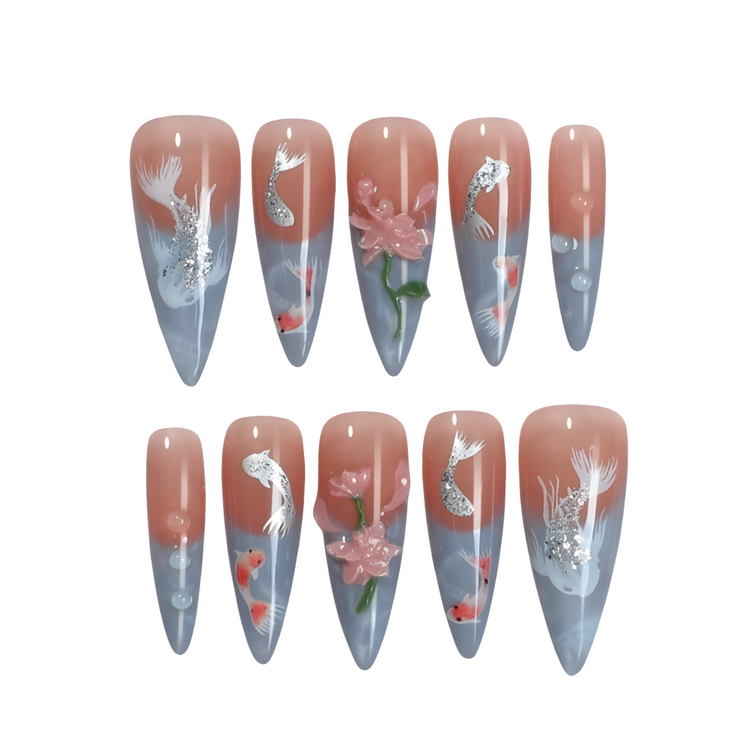 Elegant skin tone-to-grey nails featuring hand-painted koi fish, delicate florals, and water ripple details - a serene design inspired by Japanese koi ponds.