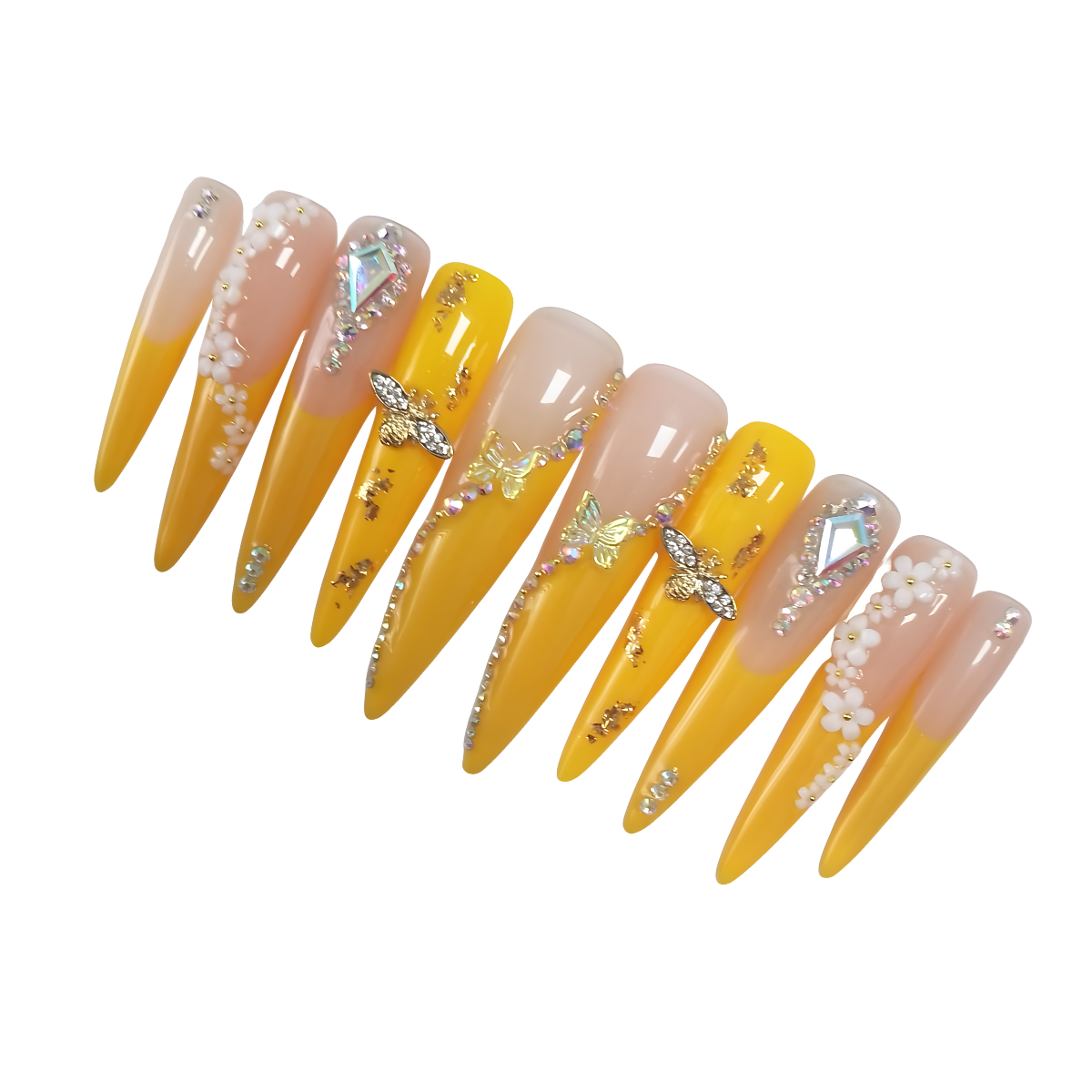 Vibrant yellow nails blended with nude tones, decorated with delicate flowers, shimmering rhinestones, and butterfly accents - a fresh, energetic design bursting with sunny charm.