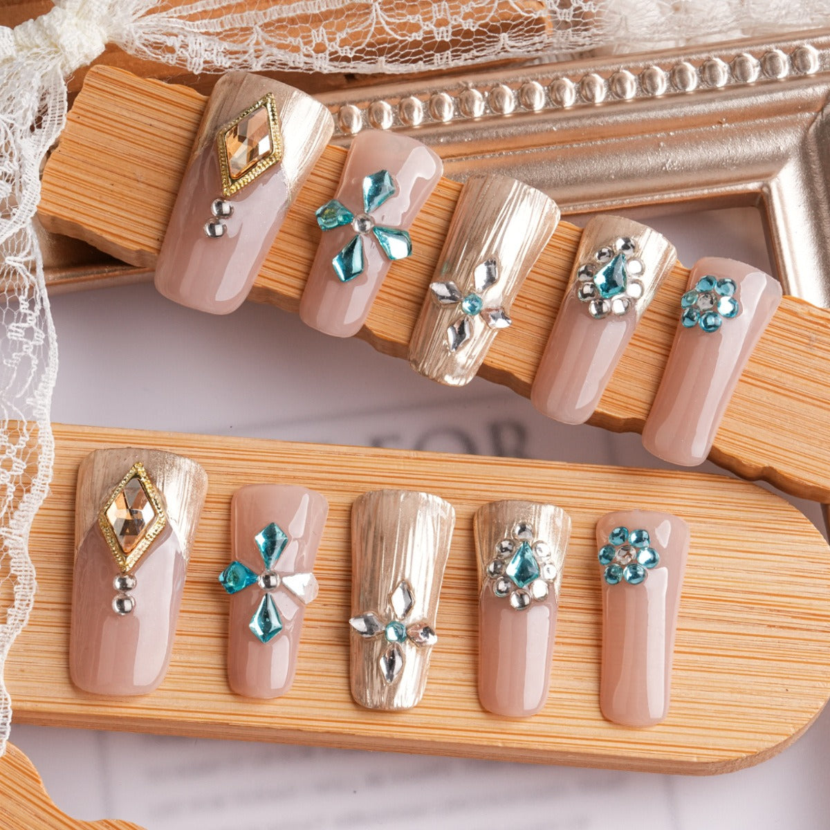 Nude and gold tones elevated with striking turquoise gems, for a look that feels both regal and modern.