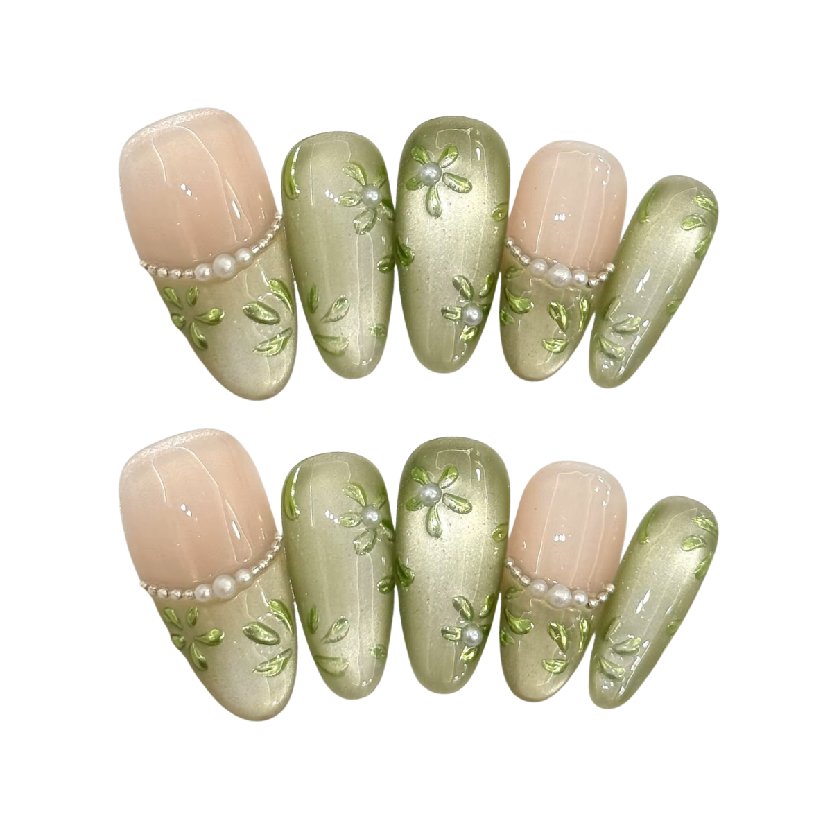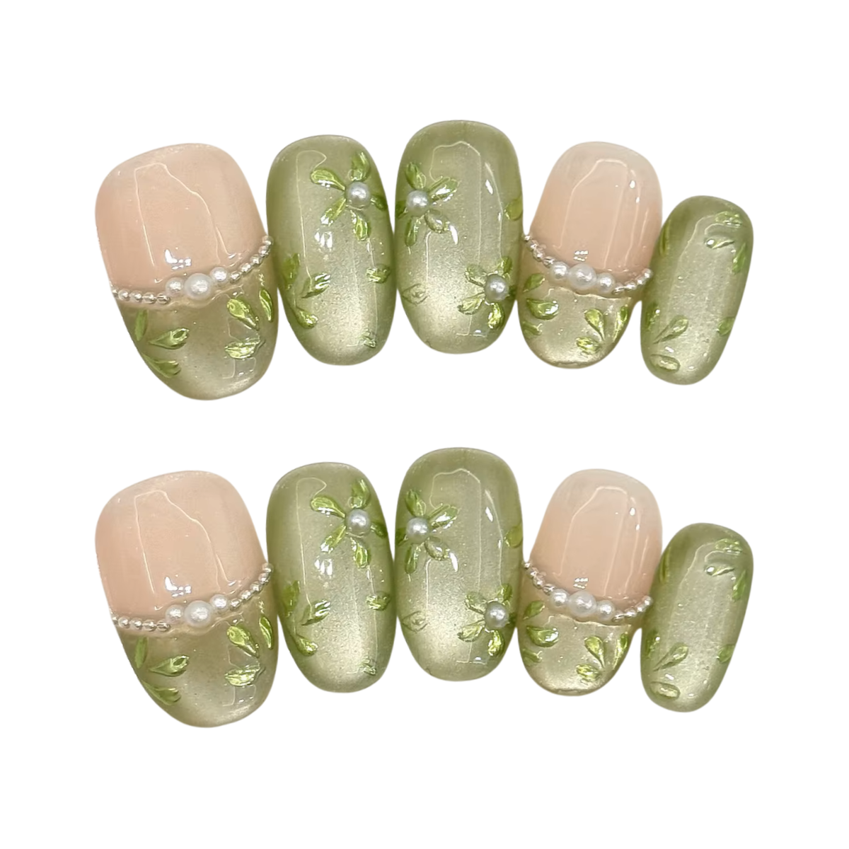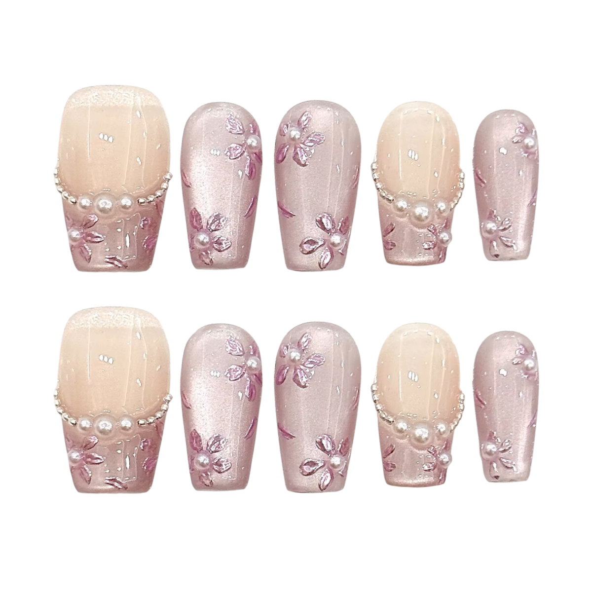 Soft pastel nails adorned with delicate pearl details and subtle floral texture