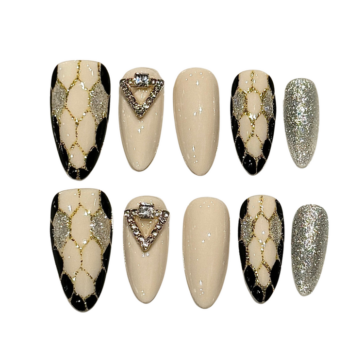 Cream base with black and gold snakeskin accents, silver shimmer, and a rhinestone centerpiece for a bold, luxe look.