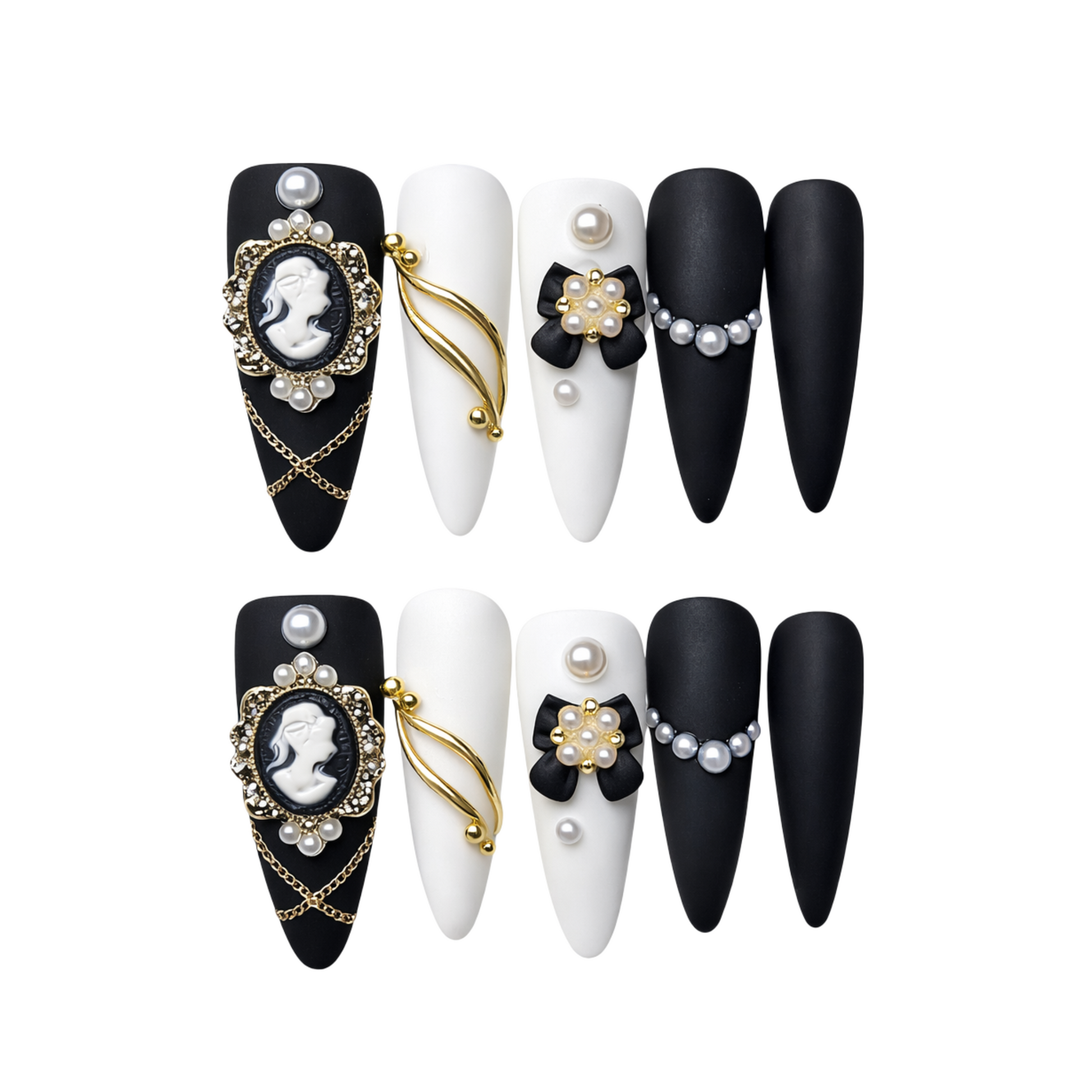 A timeless black-and-ivory design inspired by classic elegance, featuring sculpted cameos, soft pearls, and refined gold accents - sophisticated, powerful, and effortlessly aristocratic.