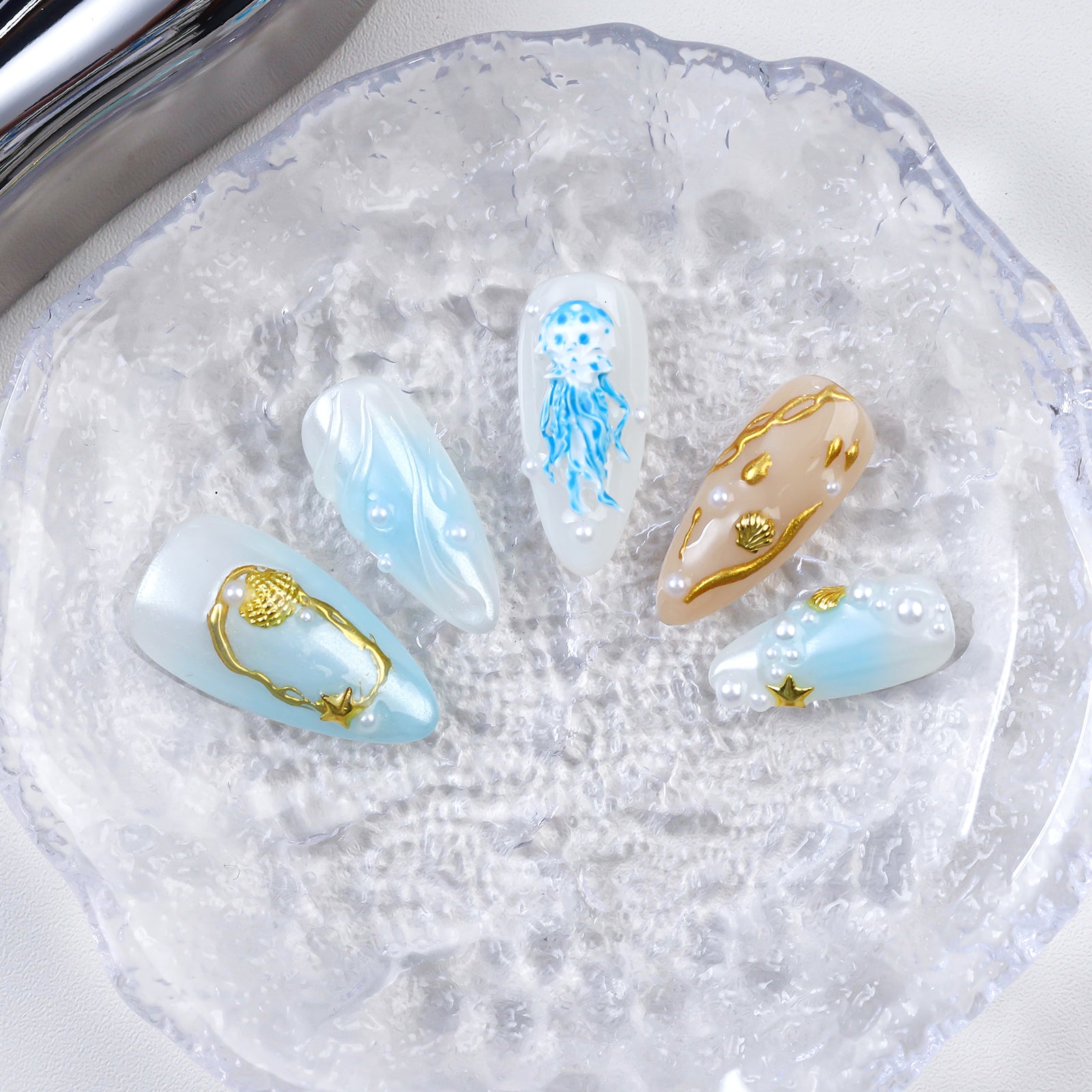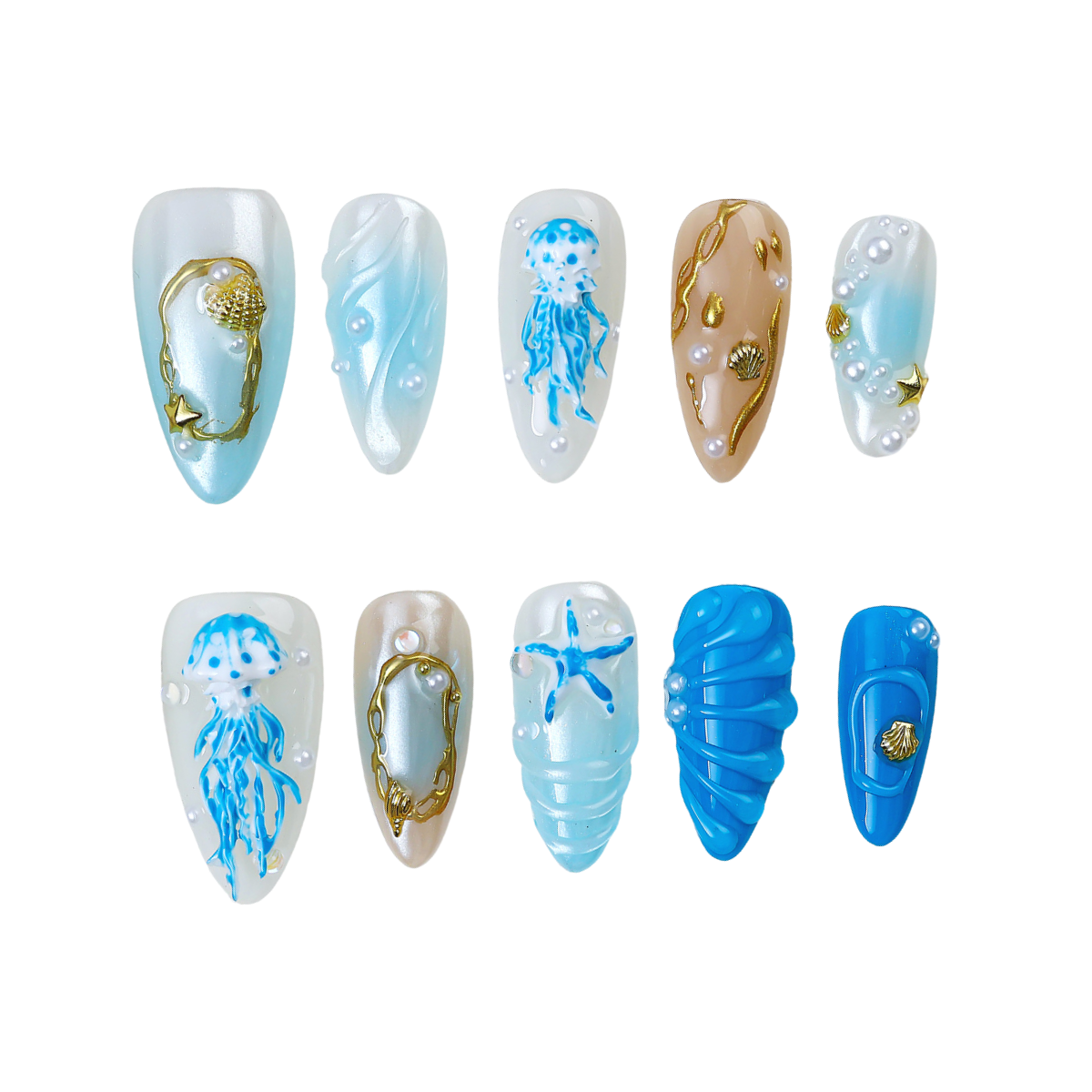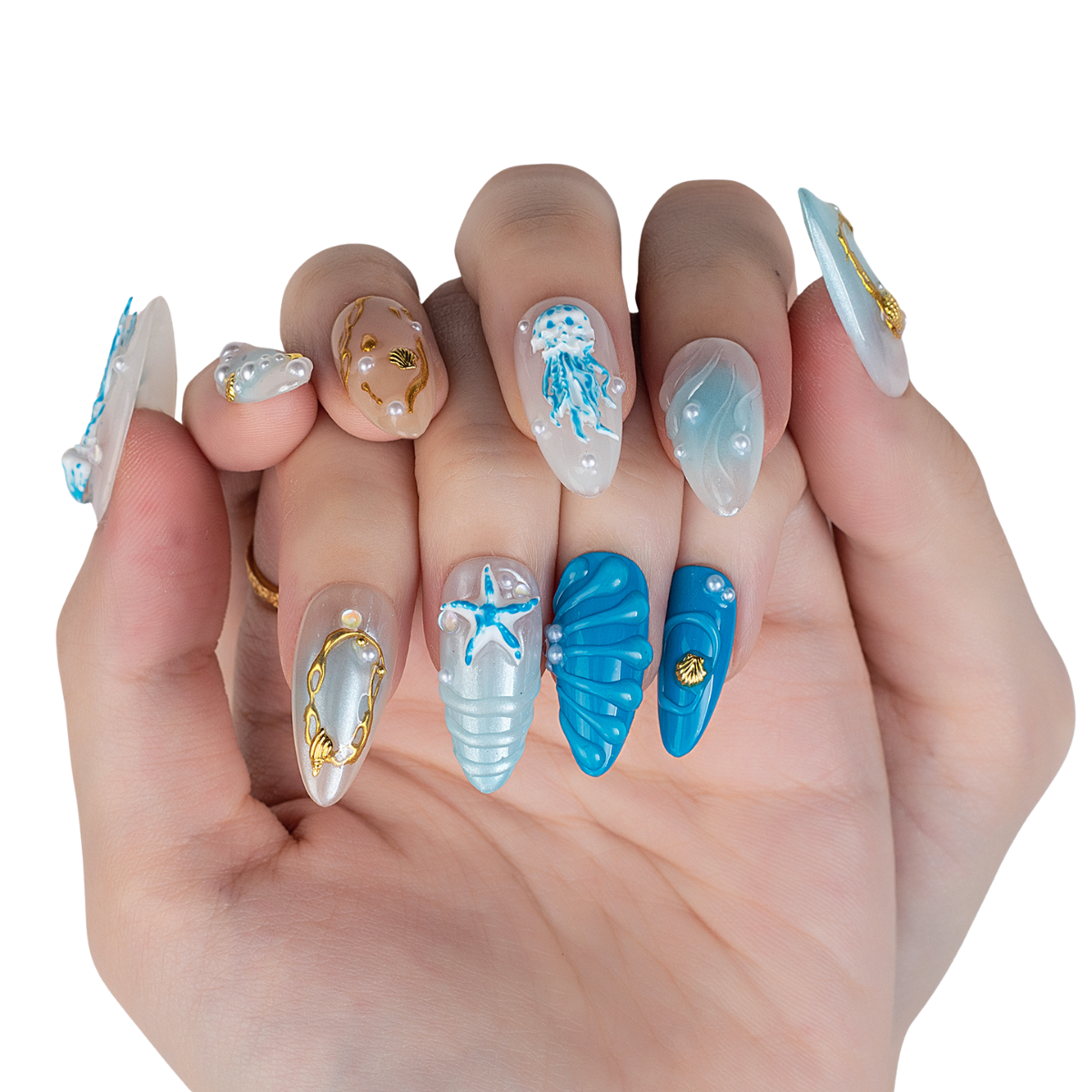 A mesmerizing blend of sea-glass blues, liquid pearls, and gilded accents - capturing the mythic allure of Medusa reborn beneath the waves, where danger meets divine elegance.