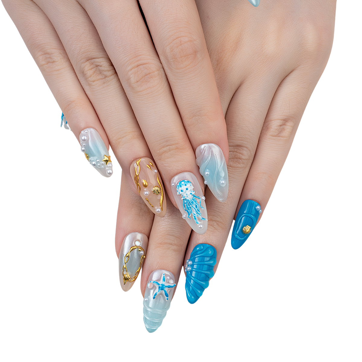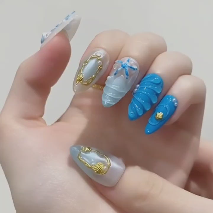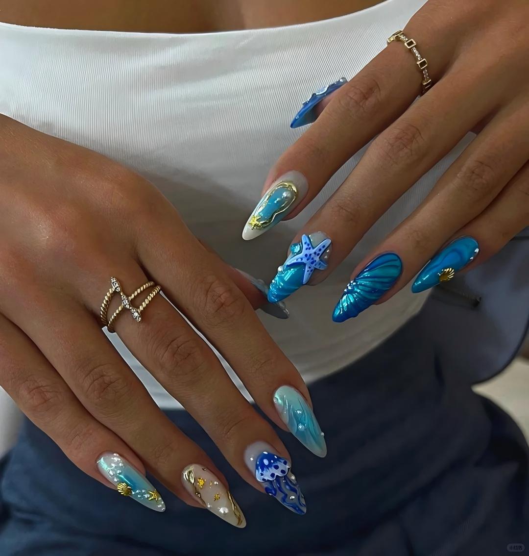 A mesmerizing blend of sea-glass blues, liquid pearls, and gilded accents - capturing the mythic allure of Medusa reborn beneath the waves, where danger meets divine elegance.
