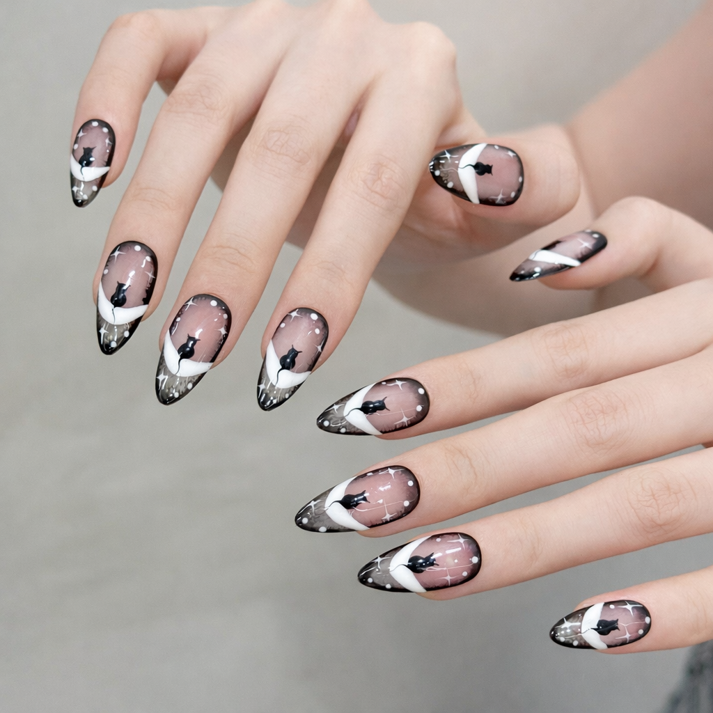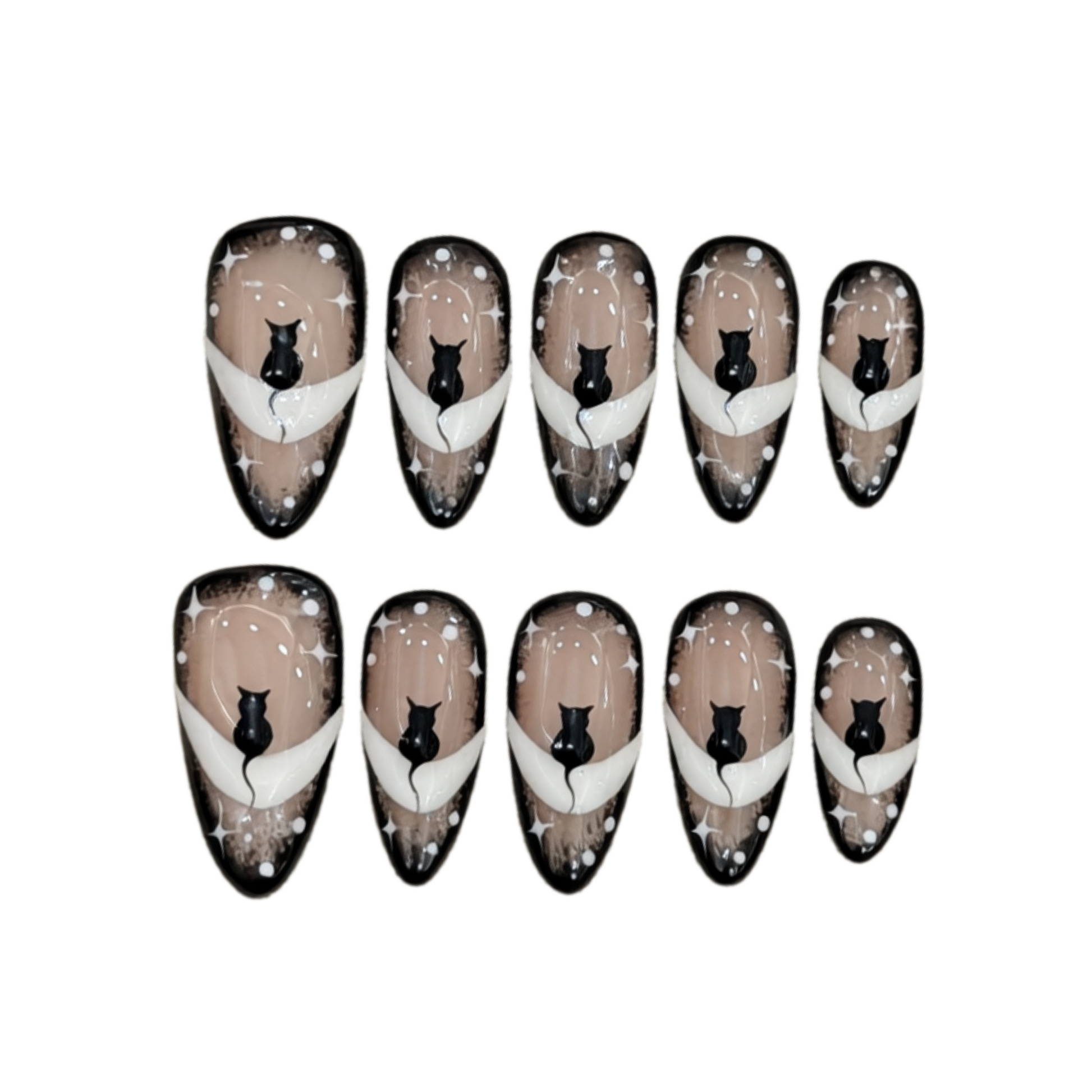 Designed with playful elegance, Meow features a soft neutral base framed by sharp black tips and delicate hand-drawn cat silhouettes. A refined yet witty design that balances minimalism with character - subtle at first glance, unforgettable up close.