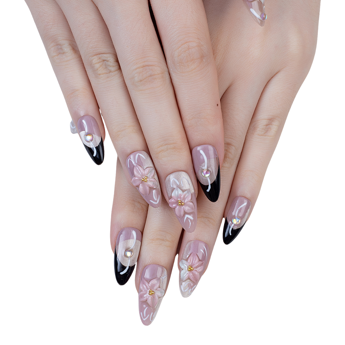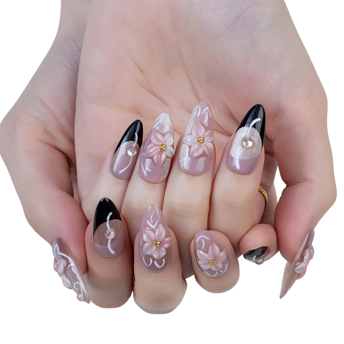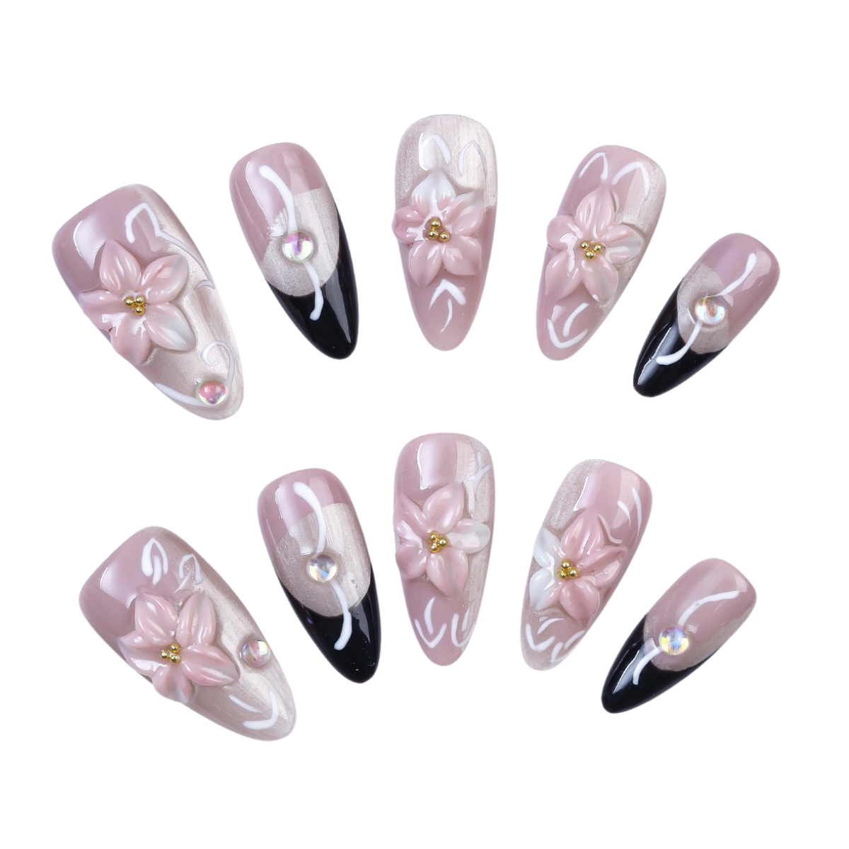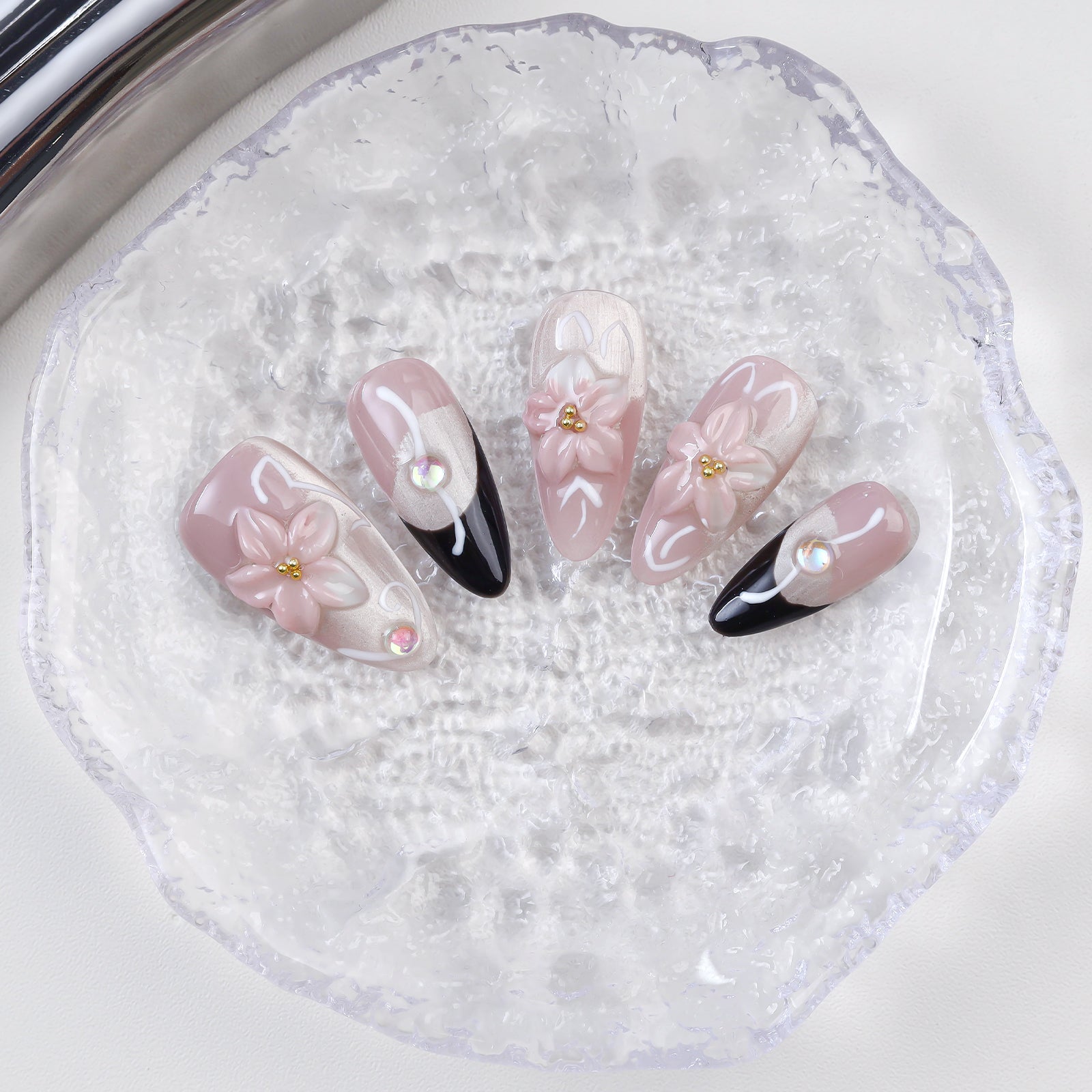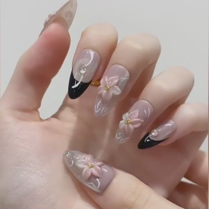 A romantic blend of 3D soft pink florals with bold black accents and shimmer details – perfect for a bride with an edge