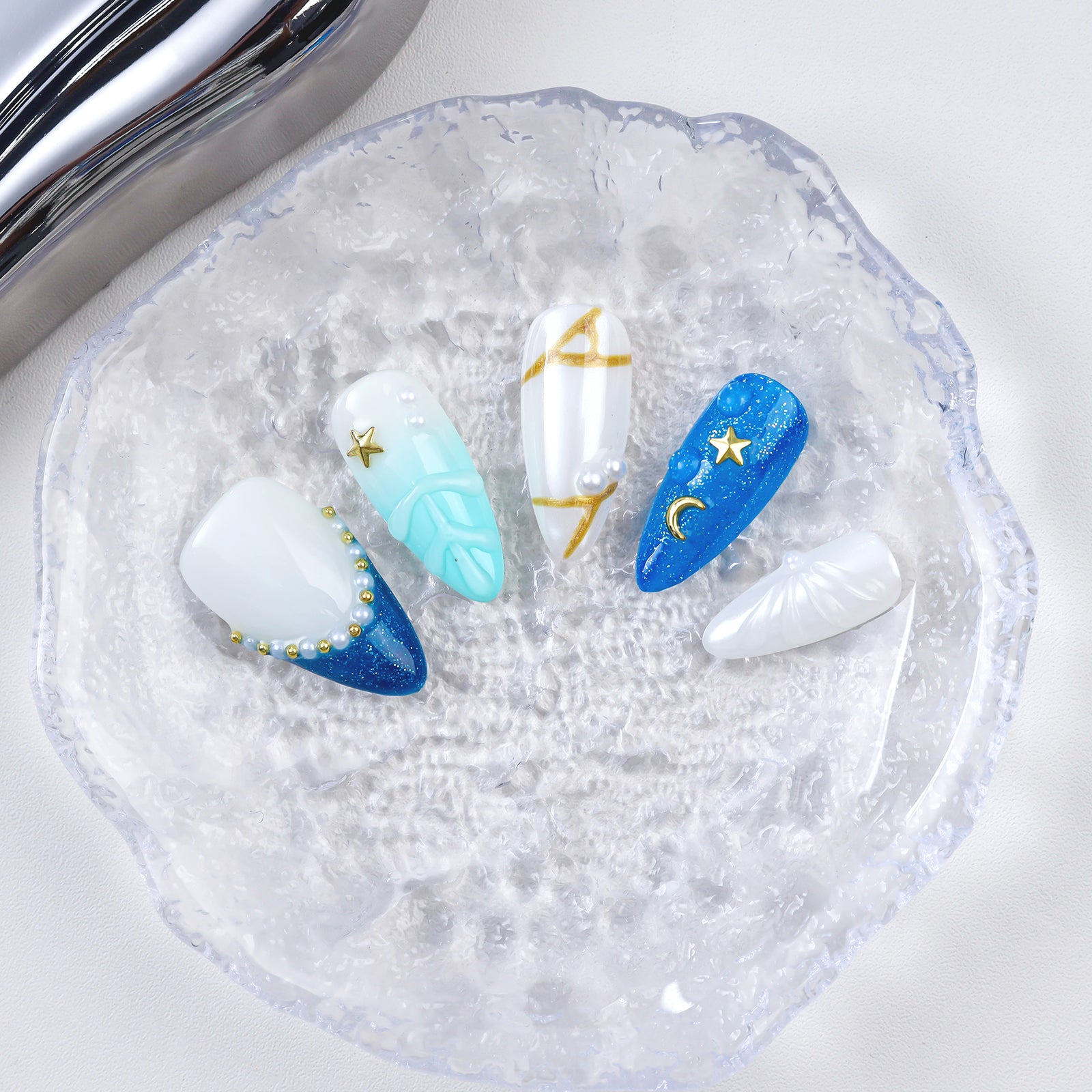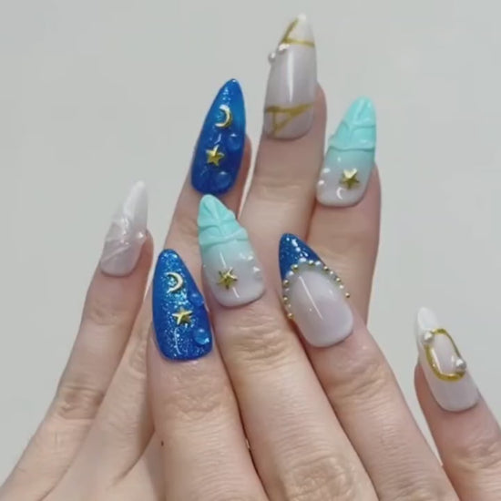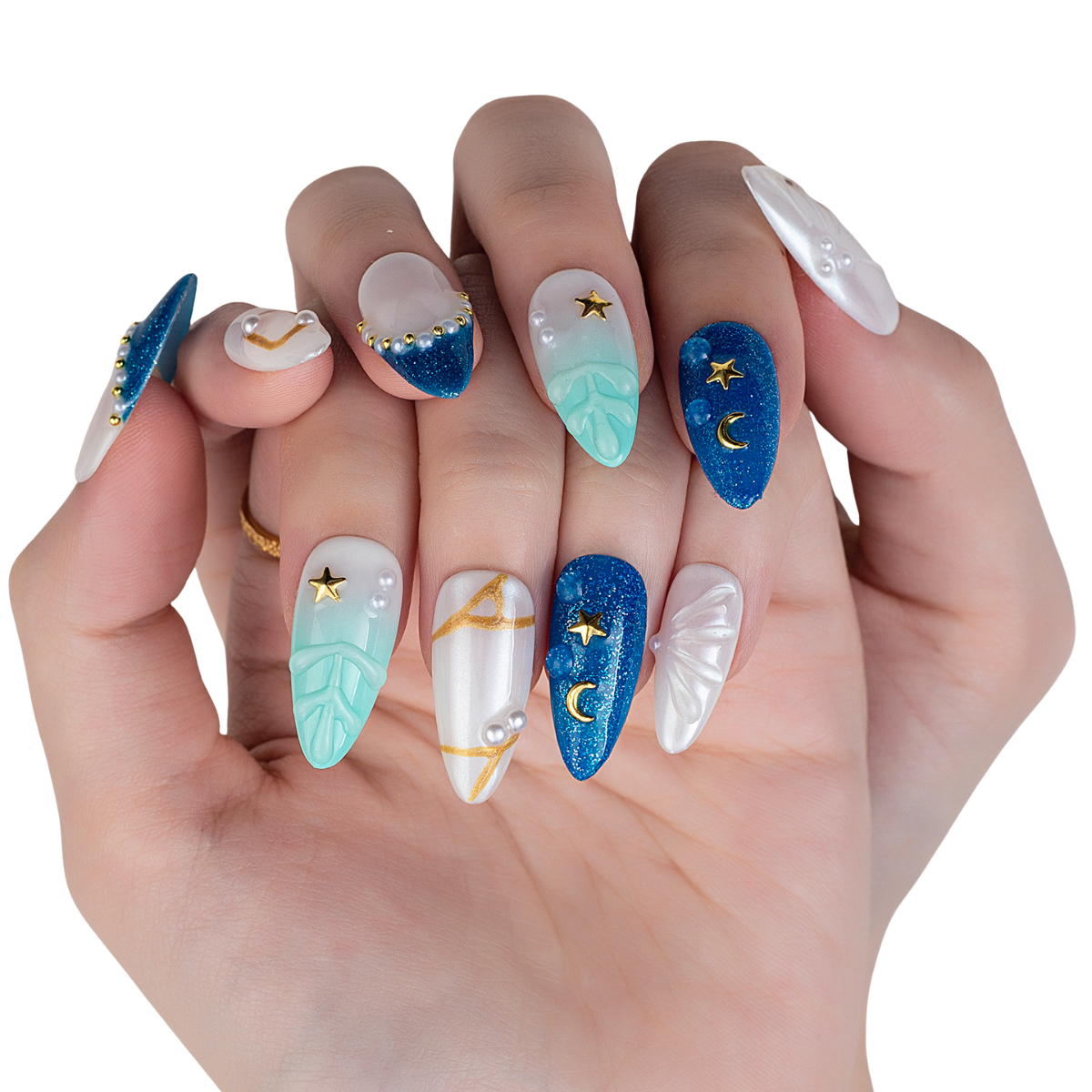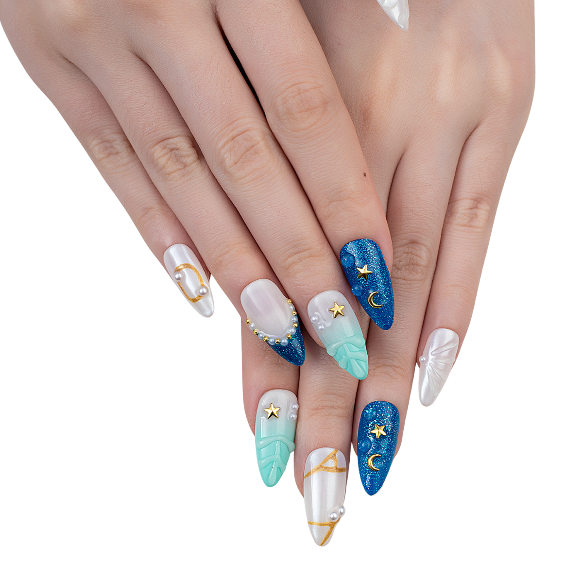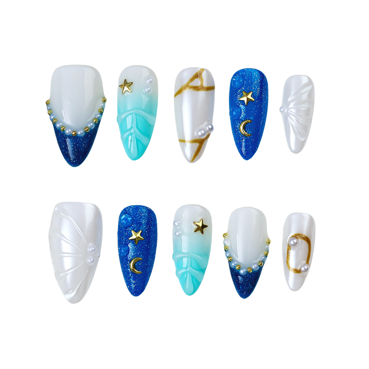 A mesmerizing blend of deep ocean blue, pearl white, and golden celestial accents - capturing the quiet pulse of moonlit tides flowing beneath a starry sky.