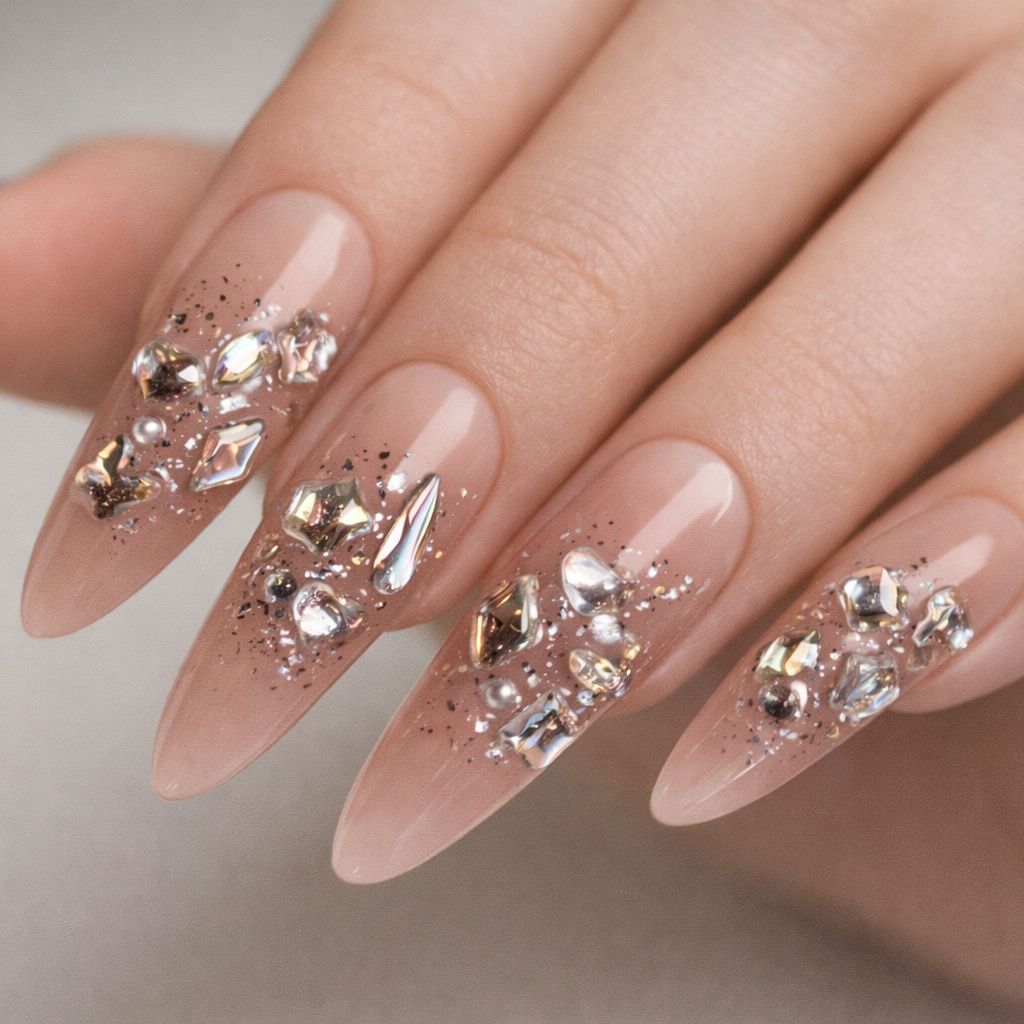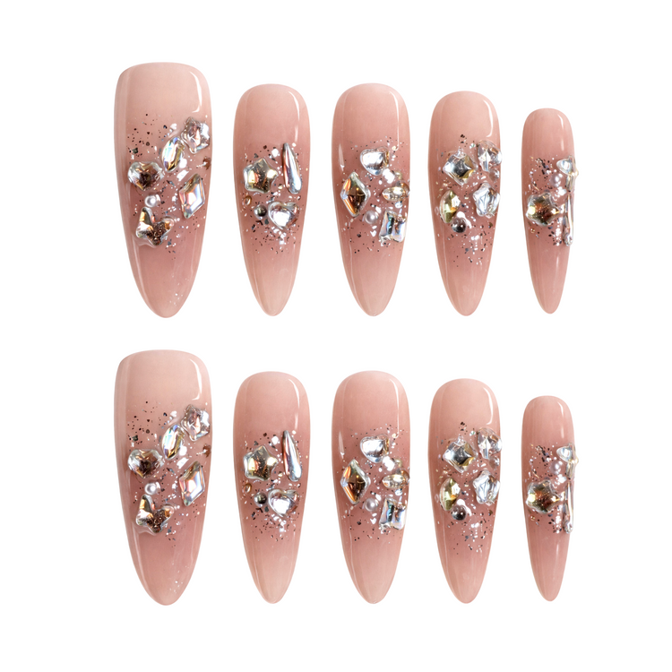 A soft blush base is elevated with scattered crystal elements, subtle metallic accents, and fine specks that add depth and dimension.