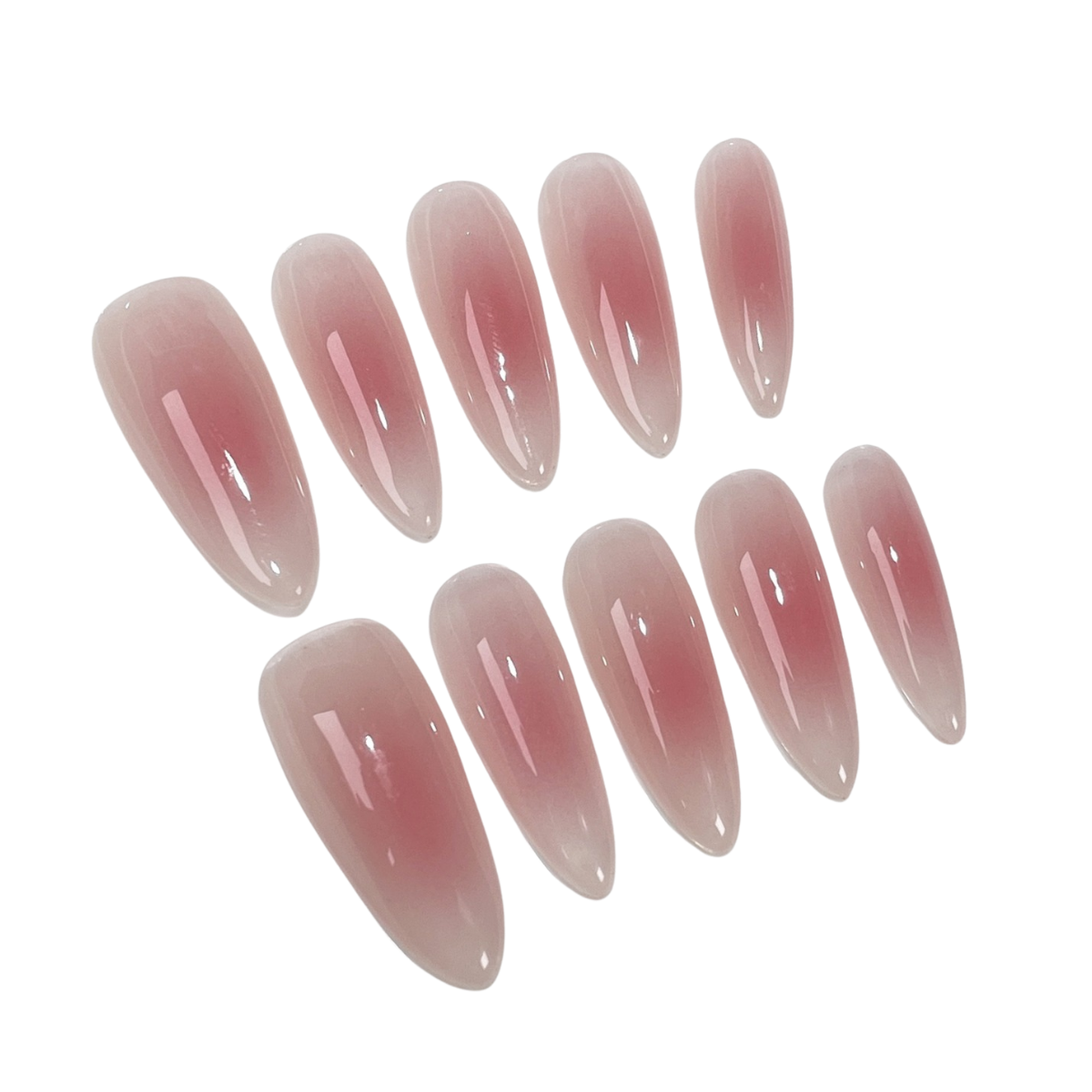 Soft nude-to-rose ombré with a glossy finish, giving a natural yet polished look.