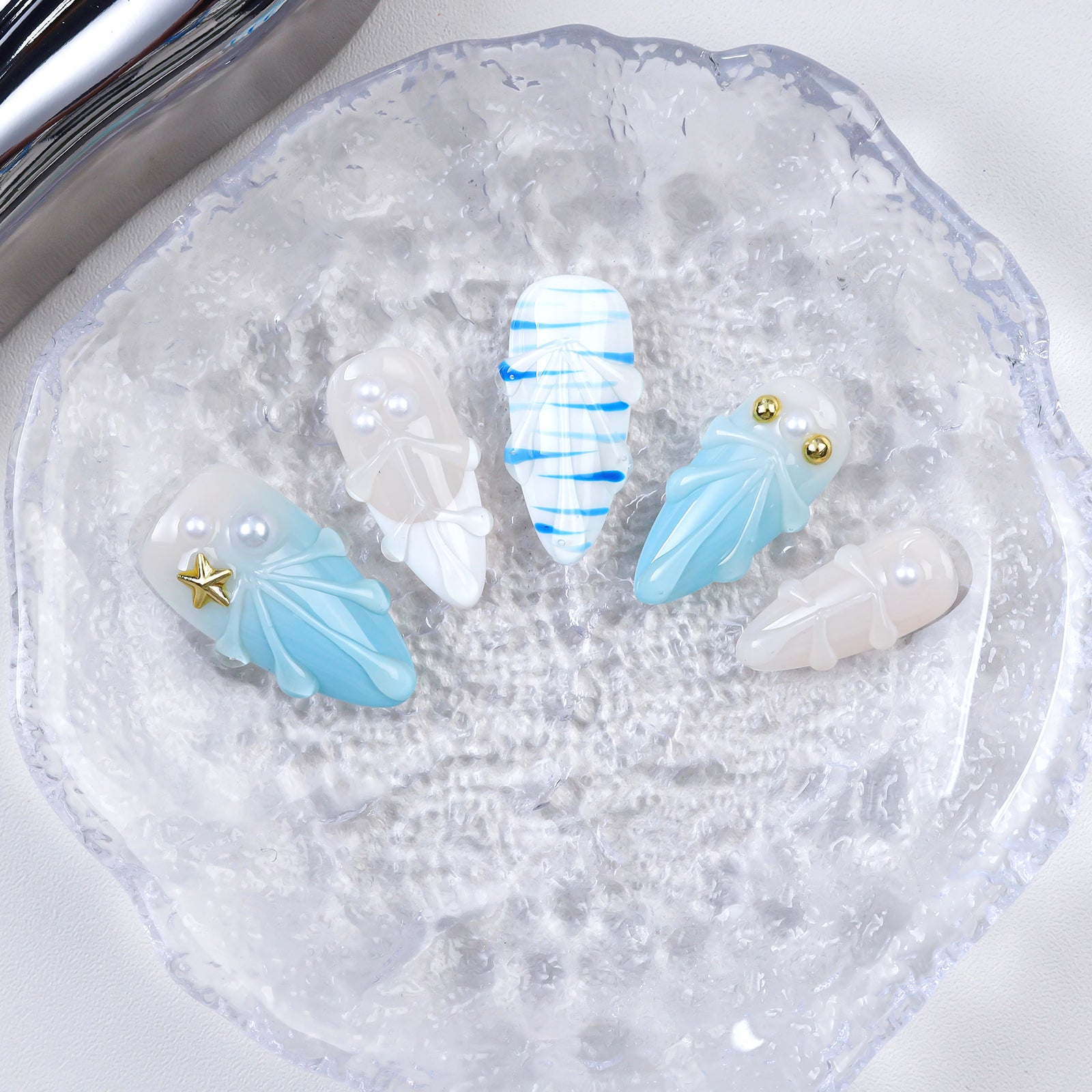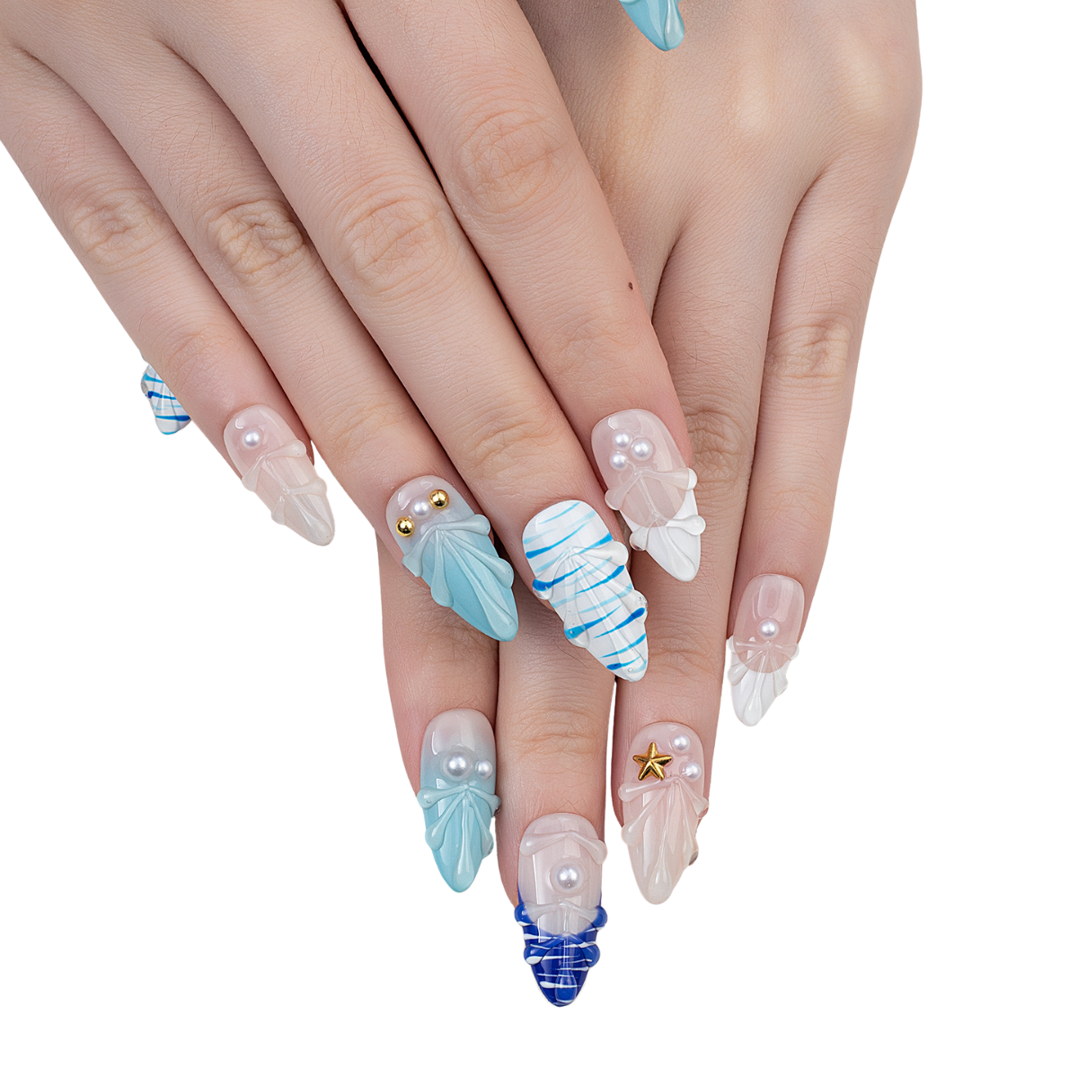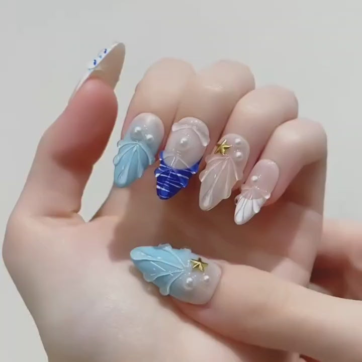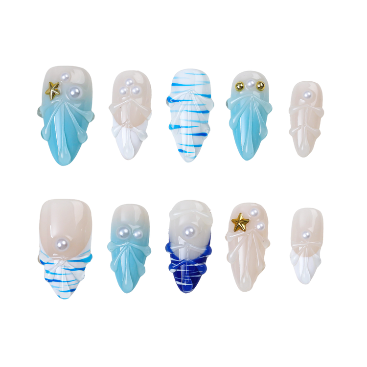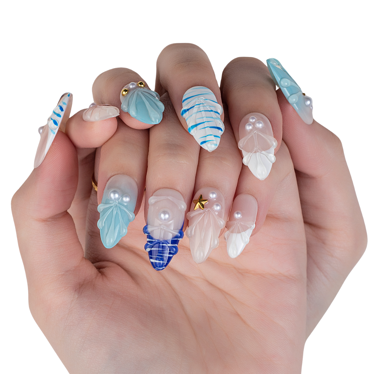 A poetic fusion of seafoam blues, pearlescent whites, and golden star accents - evoking the elegance of forgotten treasures drifting through ancient tides.