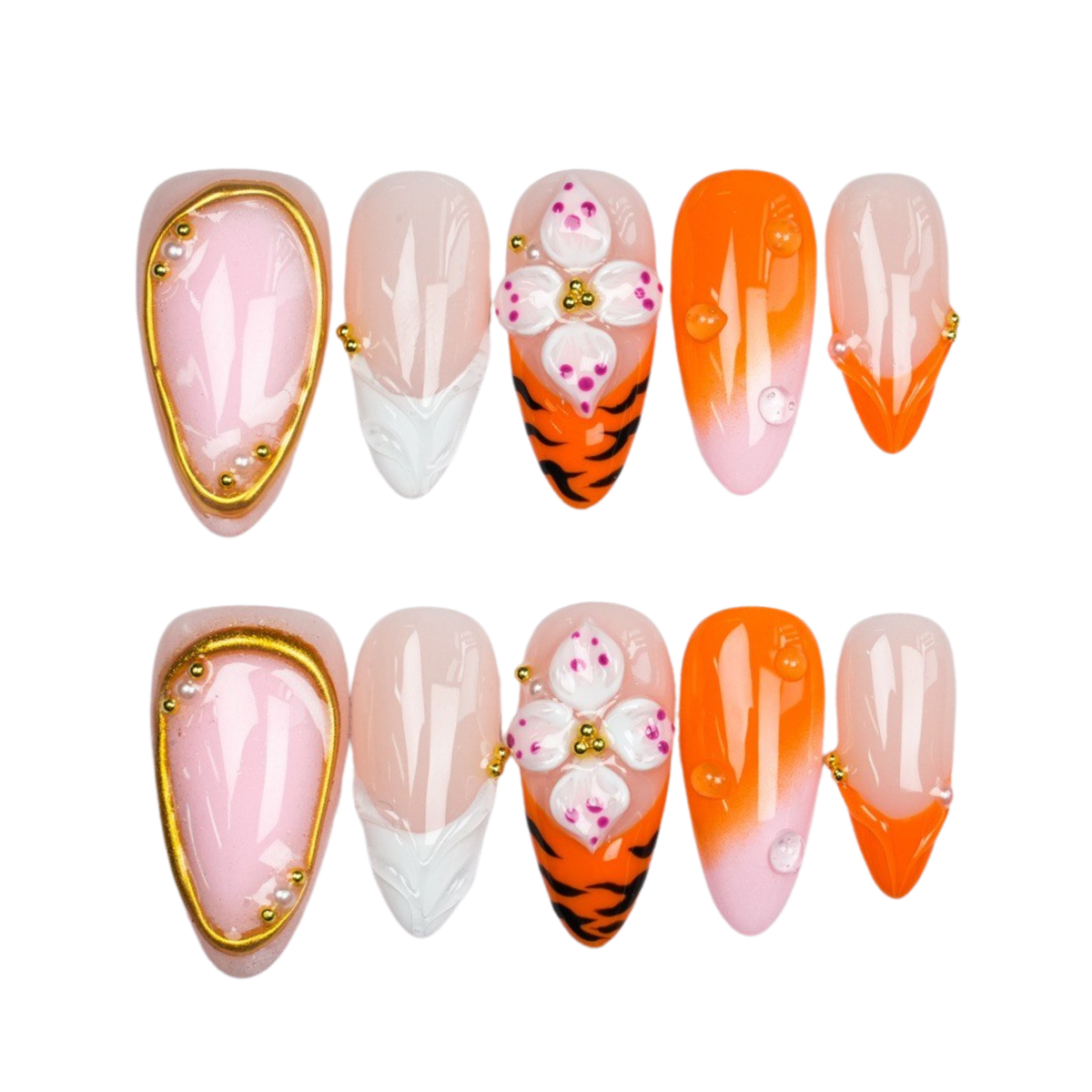 A fierce blend of orange tiger stripes, soft pink accents, and delicate floral details - a bold yet feminine summer statement.