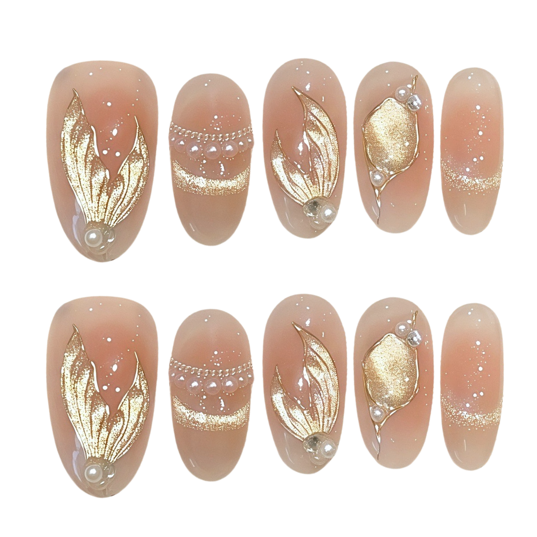 A soft nude base with metallic gold leaf accents and pearl touches - perfect for elegant evenings, galas, or a golden bridal moment.