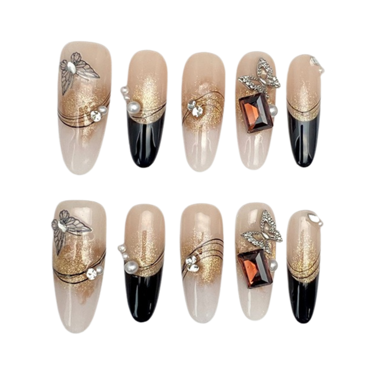 Sophisticated glamour with golden ombre, glossy black tips, and jewel-like embellishments for an opulent finish.