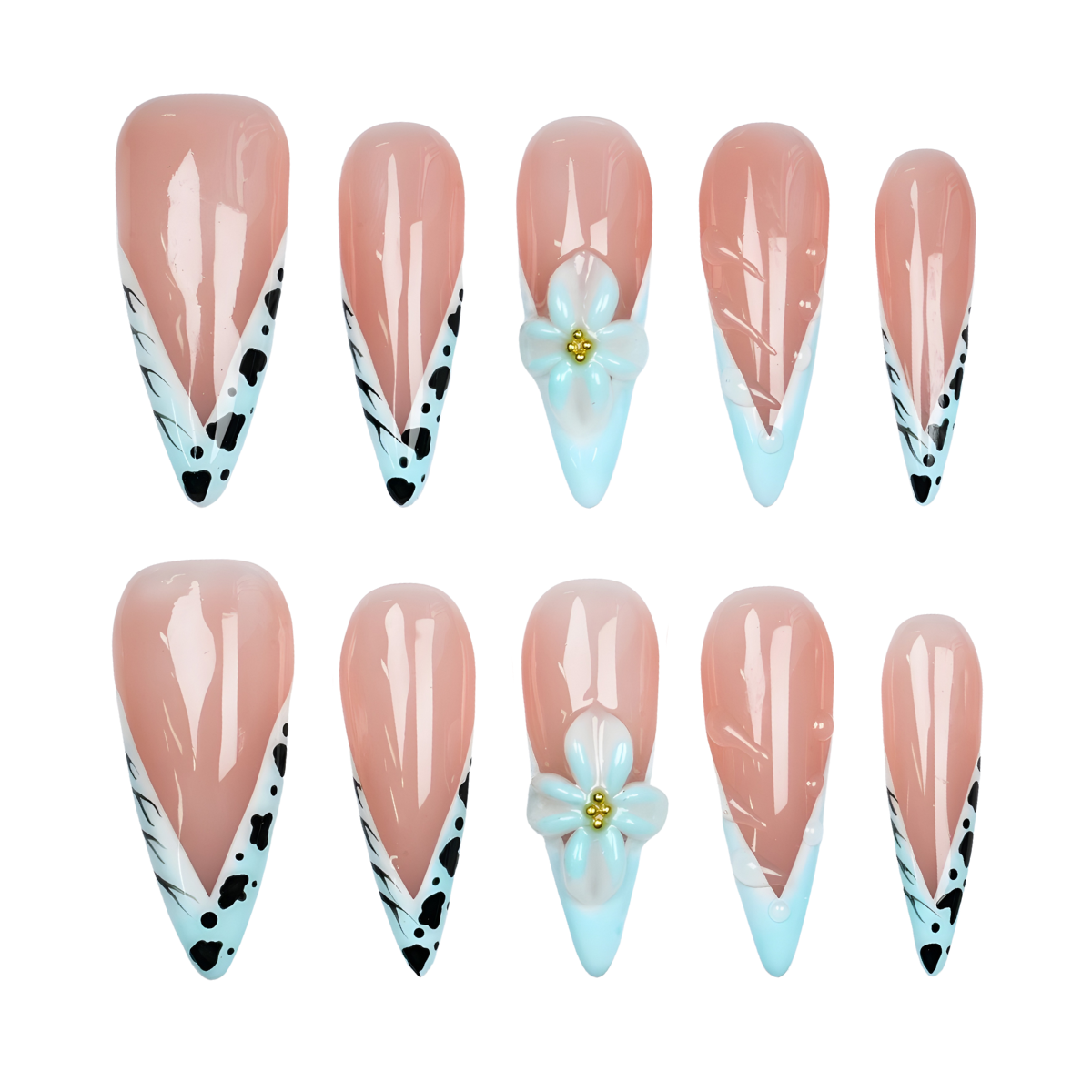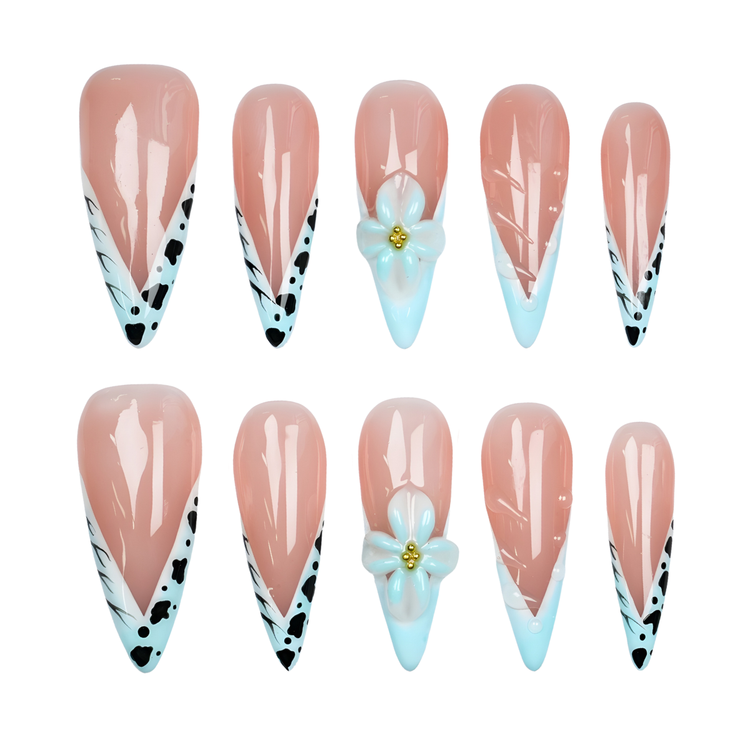 Description: A playful mix of nude and mint tips with bold black accents, finished with a delicate 3D flower for a wild yet chic vibe.