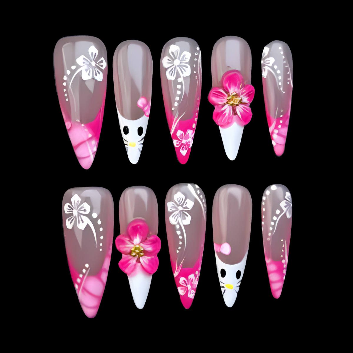 A playful blend of soft pink tones with delicate white florals and a cute kitty accent.