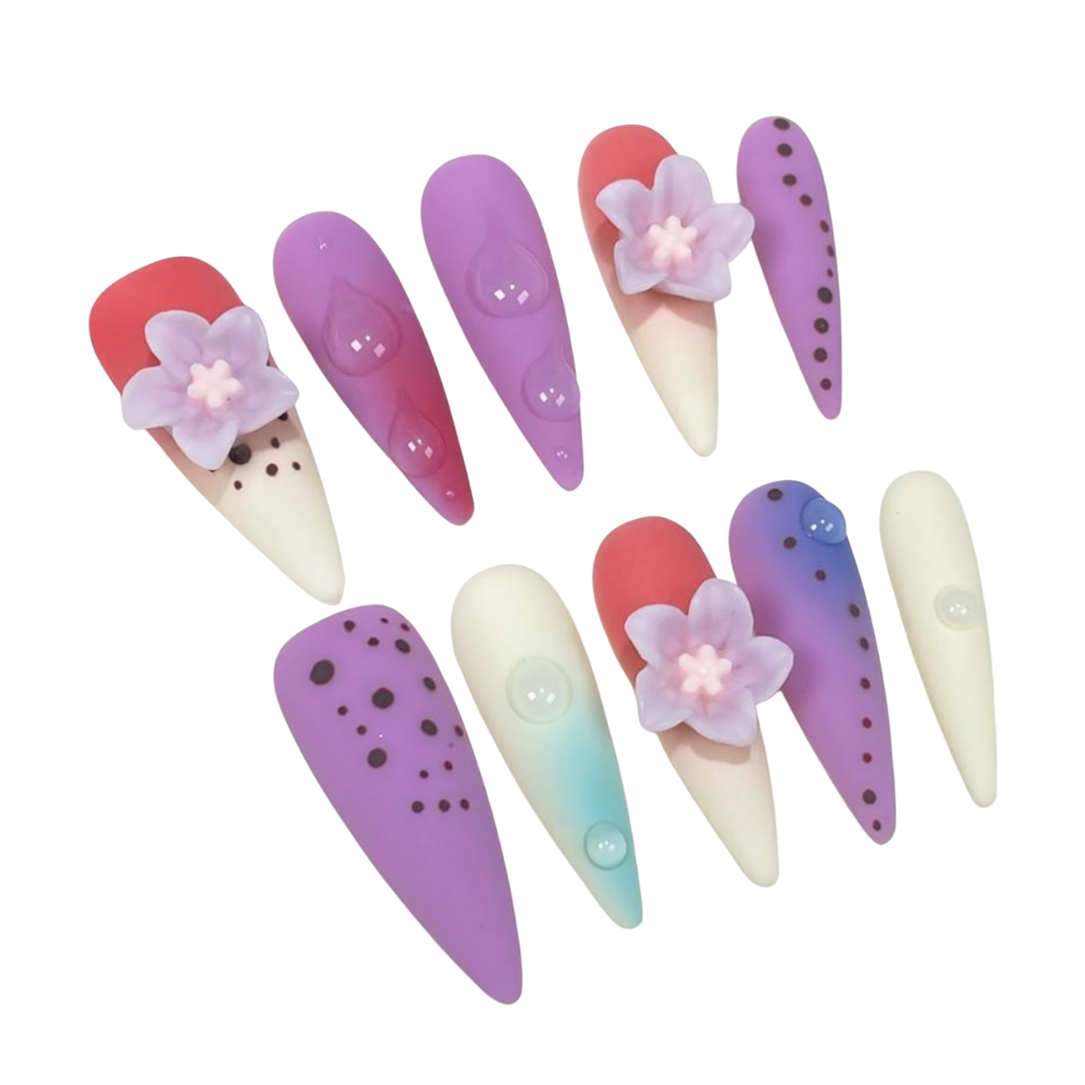 Matte nails in playful purple and cream tones, accented with 3D orchid flowers, water-drop details, and dotted patterns for a bold artistic finish.