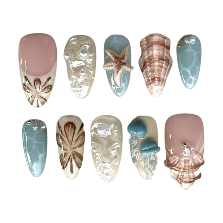 A serene coastal design inspired by seashell whispers and ocean treasures. The blend of sandy beige, pearl shimmer, and seafoam blue captures the soft magic of a hidden shoreline.