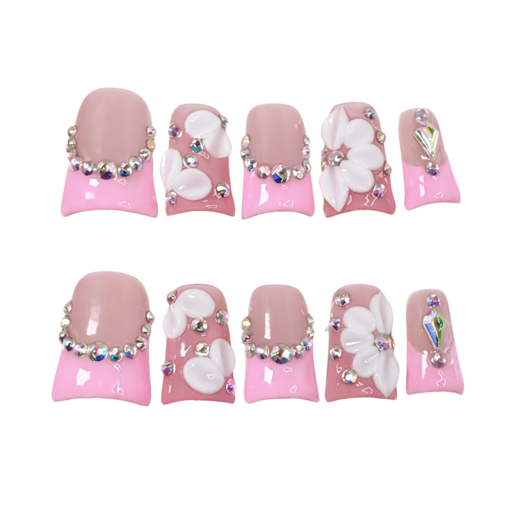 Short square nails with a glossy pink base, decorated with white 3D floral petals, shimmering crystals, and a glamorous bridal vibe. Perfect for wedding day elegance or romantic occasions
