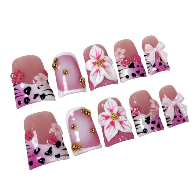 Bold pink nails with animal print accents, 3D florals, and playful bows, finished with sparkling gold studs for a fierce yet feminine vibe.