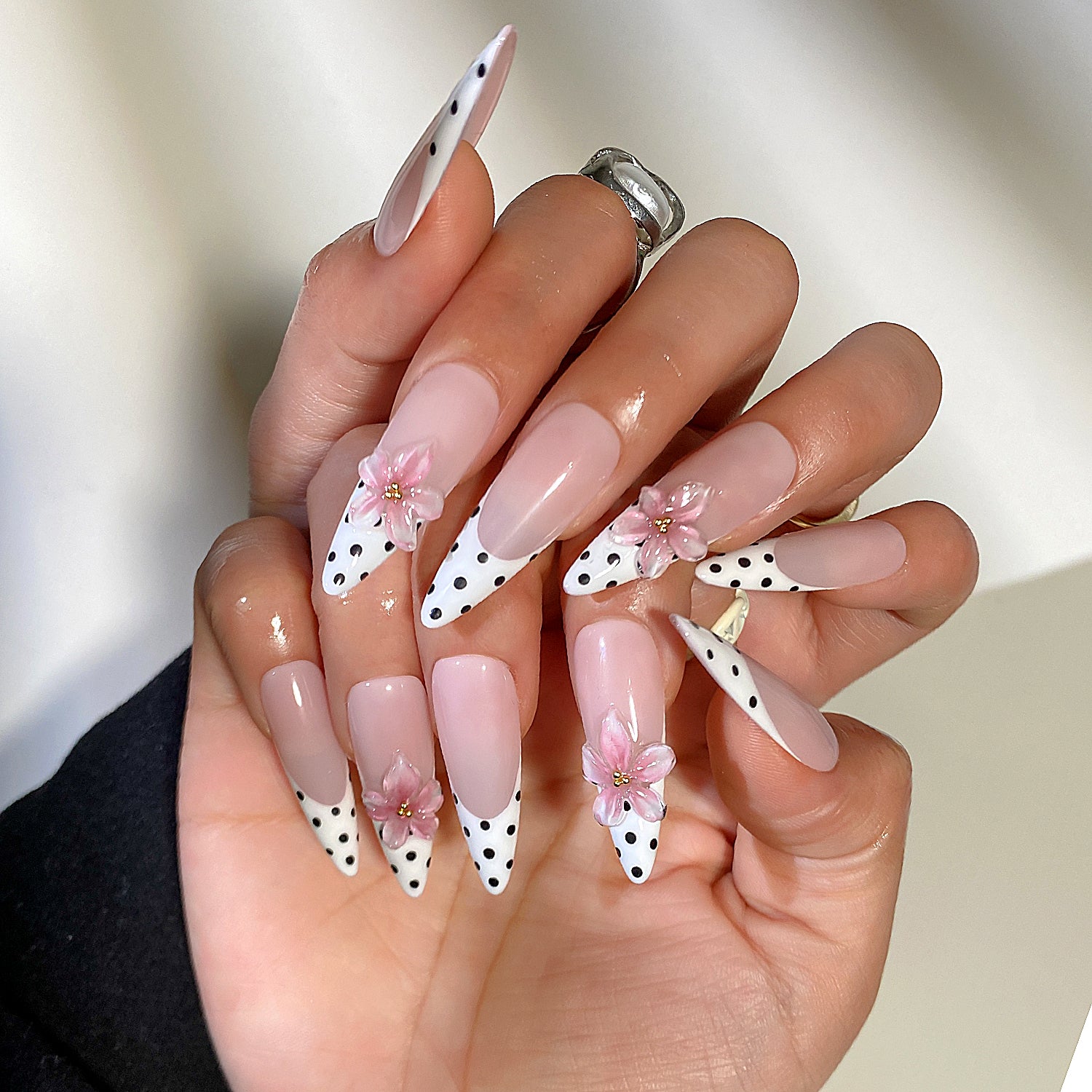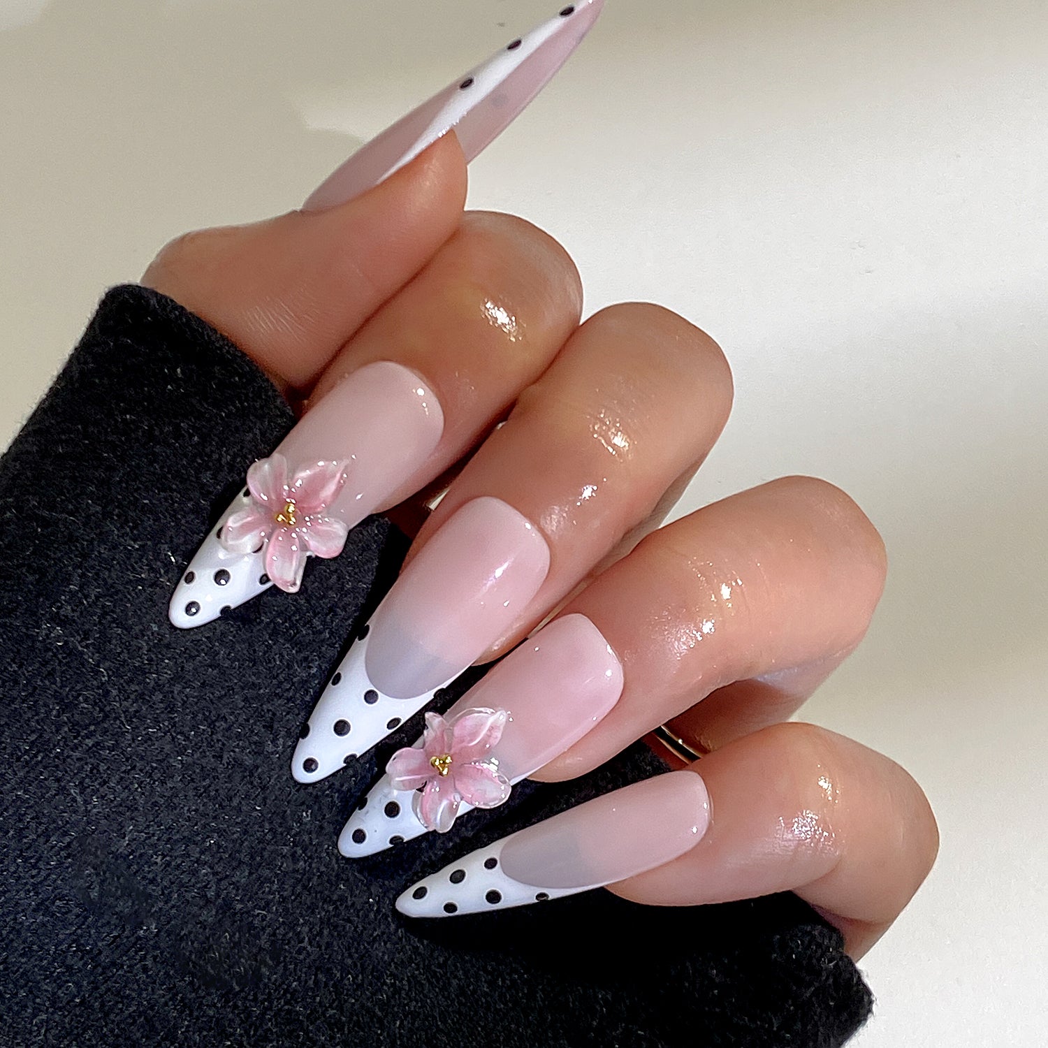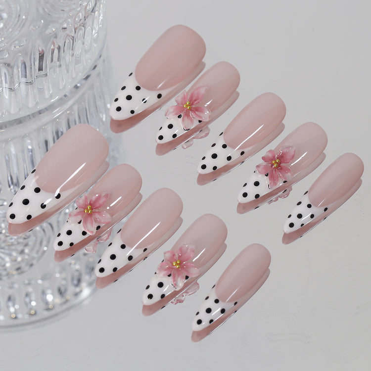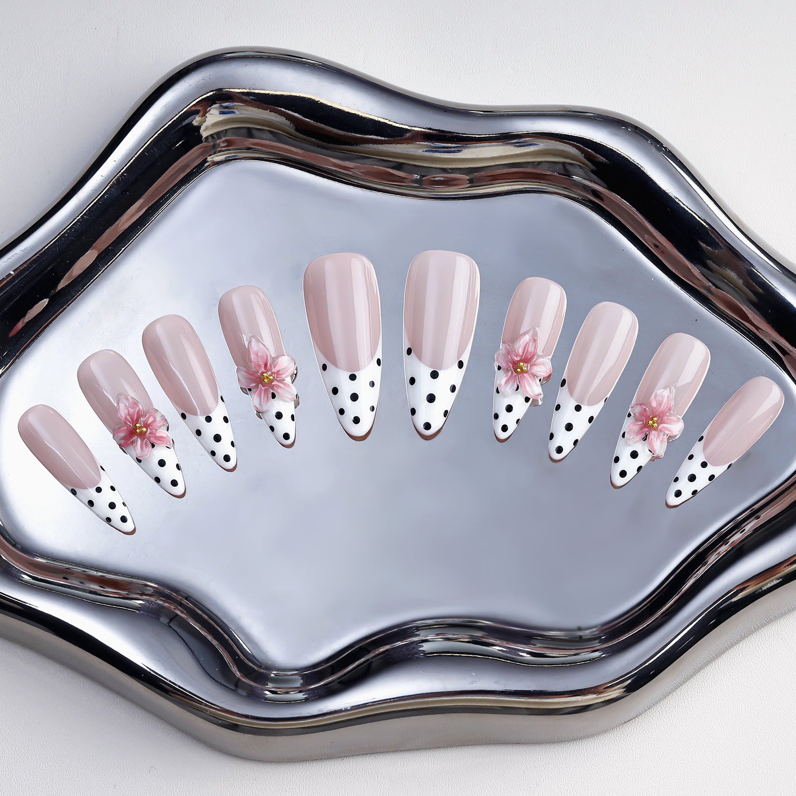 A soft skin-tone base paired with playful polka dots and delicate floral accents, finished with a smooth, glossy look.