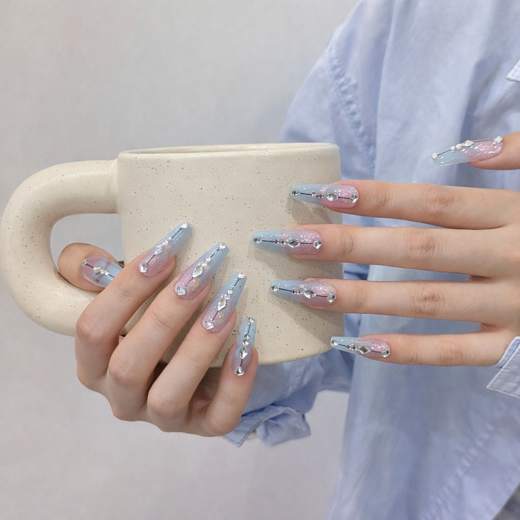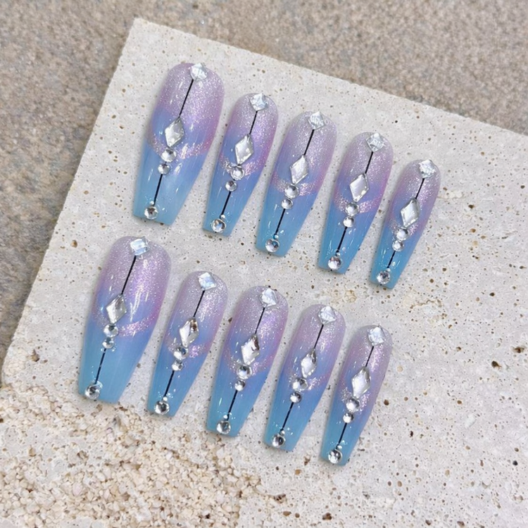 Designed for long statement nails, Purple Haze blends cool violet and blue tones with a sheer, crystal-like finish and delicate suspended details. A bold, atmospheric design that captures depth, movement, and an unmistakable edge.