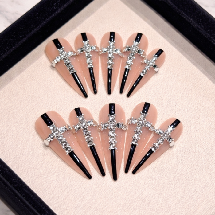 A refined skin-tone base contrasted with sharp black lines and crystal cross details, creating a powerful design inspired by sacred symbols and timeless faith.