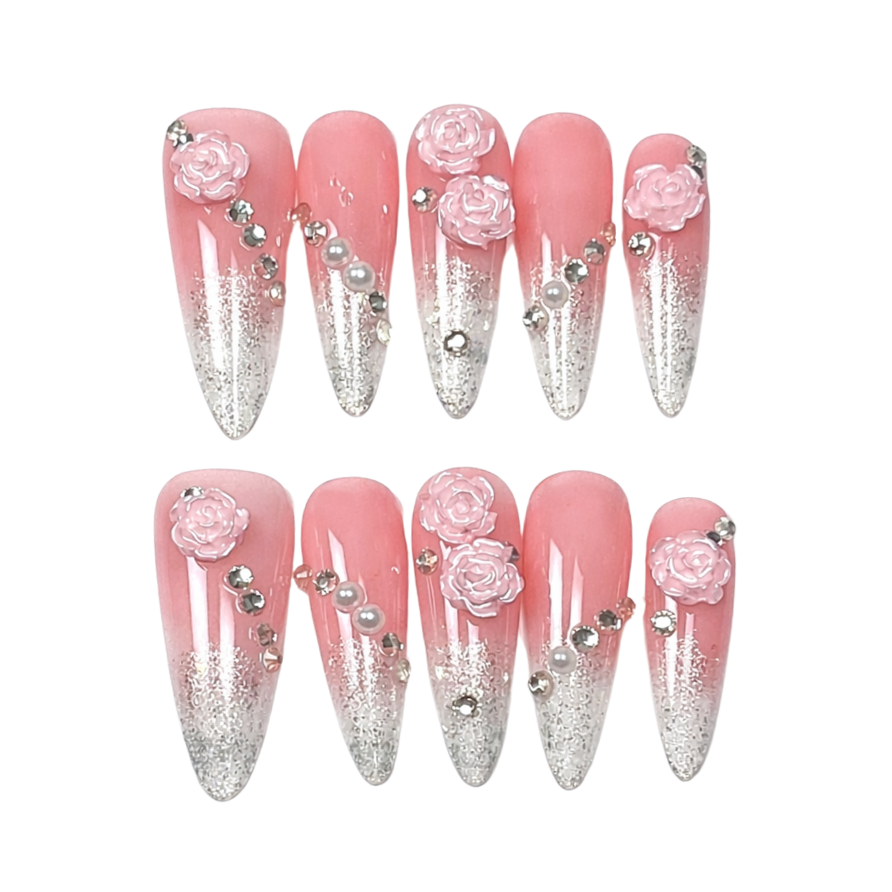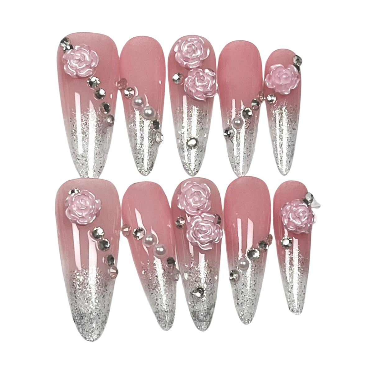Pink stiletto nails with silver glitter tips, adorned with 3D roses, pearls, and crystals for a glamorous finish.