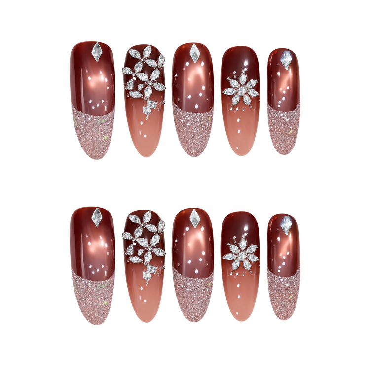 Select nails are adorned with precision-set crystal elements arranged in elegant floral and geometric patterns, adding dimension and a sophisticated focal point. Subtle glitter at the tips enhances depth while maintaining a balanced, elevated aesthetic.